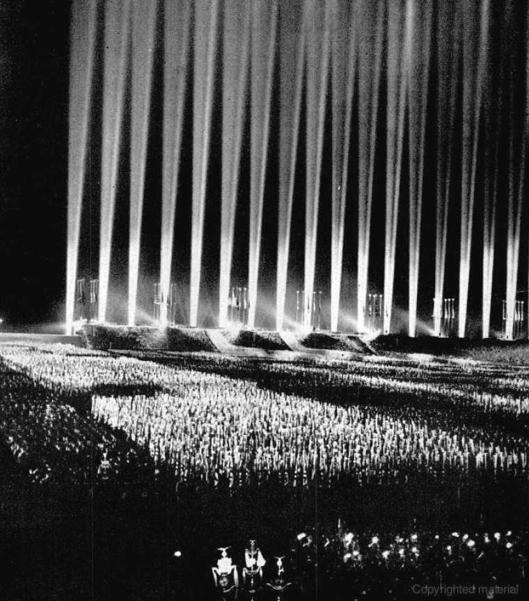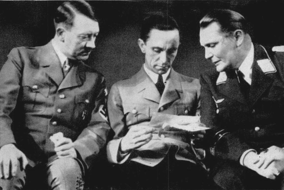 Нацистский триумвират в необычной позе с Геббельсом посередине вместо Гитлера. Адольф Гитлер мечтает об этом, Геббельс популяризирует их, а Геринг исполняет нижеприведенное, величайшее шоу Геббельса - съезд партии в Нюрнберге.Приветствие "Хайль Гитлер!" было его идеей.