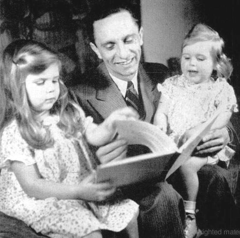 КАК гордый отец, он позирует со своими дочерьми Хельгой (слева) и Хильдой. У него есть две младшие дочери, сын Хельмут, 3 года, и пасынок Харальд, 13 лет. Он пытался назвать своих детей "героически". Детство самого Геббельса было несчастливым.