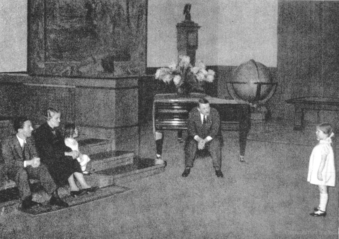 В ГОСТИНОЙ ГЕББЕЛЬСА ВНИМАТЕЛЬНЫЙ ГИТЛЕР СЛУШАЕТ ДЕКЛАМИРУЮЩУЮ 6-ЛЕТНЮЮ ХЕЛЬГУ. ТАКЖЕ В КАДРЕ РОДИТЕЛИ ХЕЛЬГИ И 4-ЛЕТНЯЯ СЕСТРА ХИЛЬДА