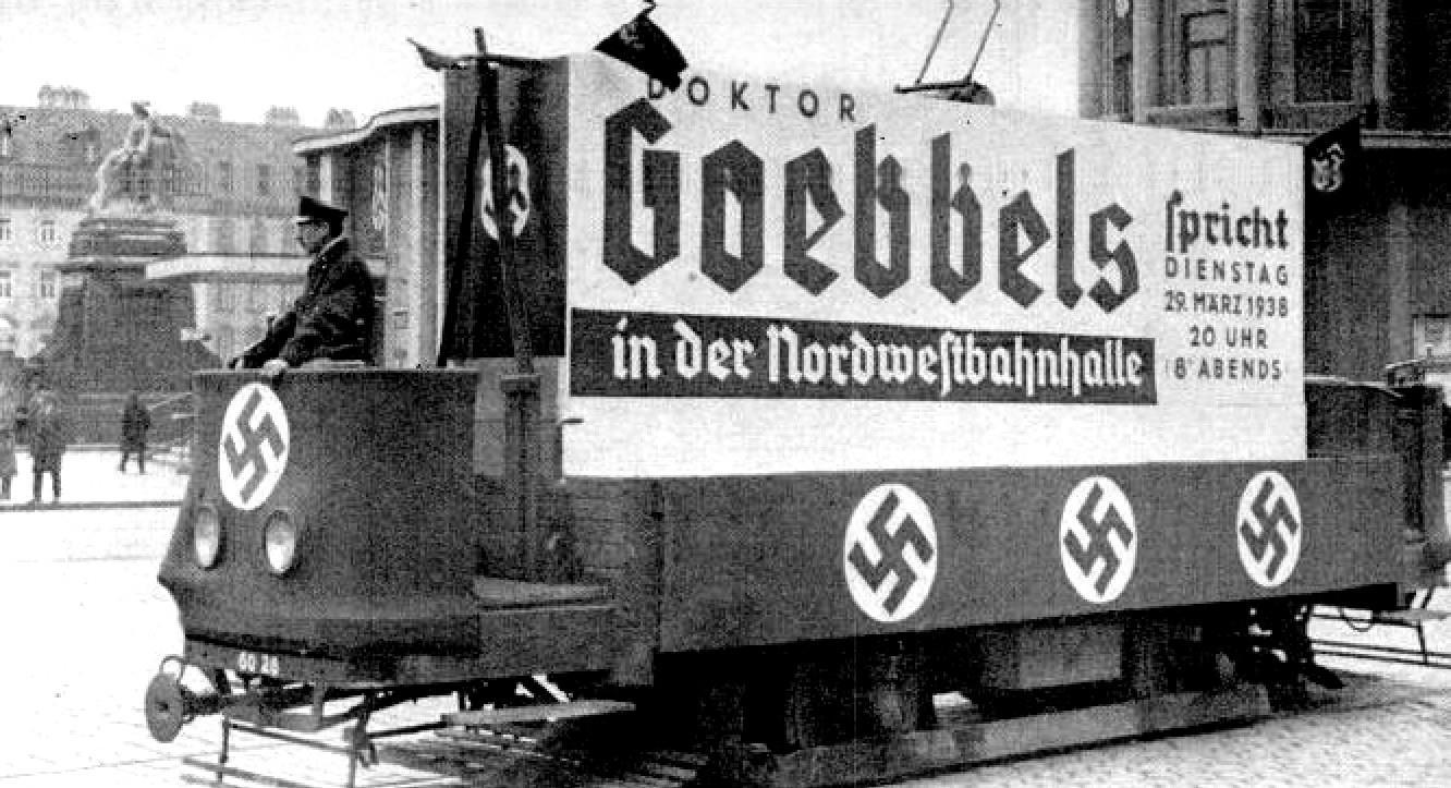 Специальные трамваи - часть пропагандистского приема Геббельса для объявления о его выступлении в Вене. Он решает, что 78 000 000 немцев могут увидеть, услышать и прочитать. "Глупо предполагать, - говорит он, - что народ хочет править сам собой”. Он даже подвергает цензуре фюрера Гитлера и Геринга.