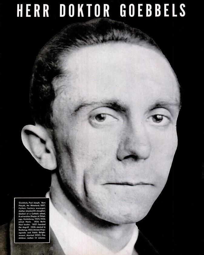 Геббельс, Пауль Йозеф. Бом-Фейдт, Рейнская область, 1897 год. Отец: директор фабрики. Мать: дочь кузнеца. Учился в католической школе, 8 университетах (доктор филологии, Гейдельберг, 1921). 1924: присоединился к нацистам. 1926: лидер нацистов в Берлине. 1927: основал Der Angriff. 1928: избран в рейхстаг. 1933: министр пропаганды и народного просвещения. Женат (1931). Пятеро детей. Автор: 14 томов.