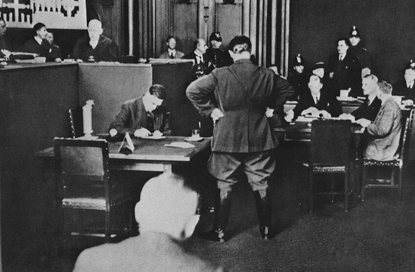 Будучи спикером рейхстага, Геринг (спиной к камере) вел ожесточенную словесную дуэль на процессе о поджоге рейхстага в 1933 году с Георгием Димитровым (стоит справа), обвиняемым. Суд отстранил Димитрова.
