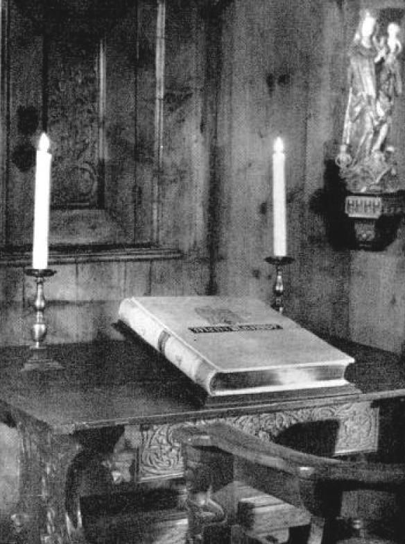 Специальное издание ”Майн Кампф", подаренное Герингу Гитлером, выставлено в "Карин Холле" между двумя горящими свечами, рядом с мадонной.