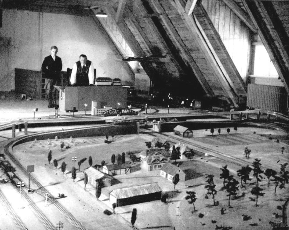 СО СВОЕЙ МОДЕЛЬЮ ЖЕЛЕЗНОЙ ДОРОГИ НА ВЕРХНЕМ ЭТАЖЕ ФЕЛЬДМАРШАЛ ГЕРИНГ РАЗВЛЕКАЕТ СВОИХ ПЕРВЫХ ПОСЕТИТЕЛЕЙ