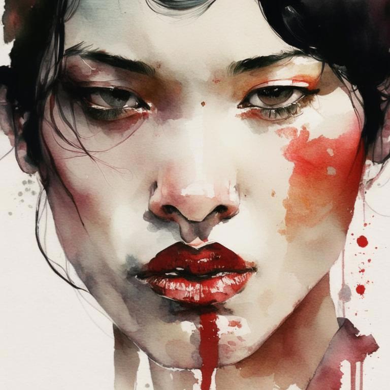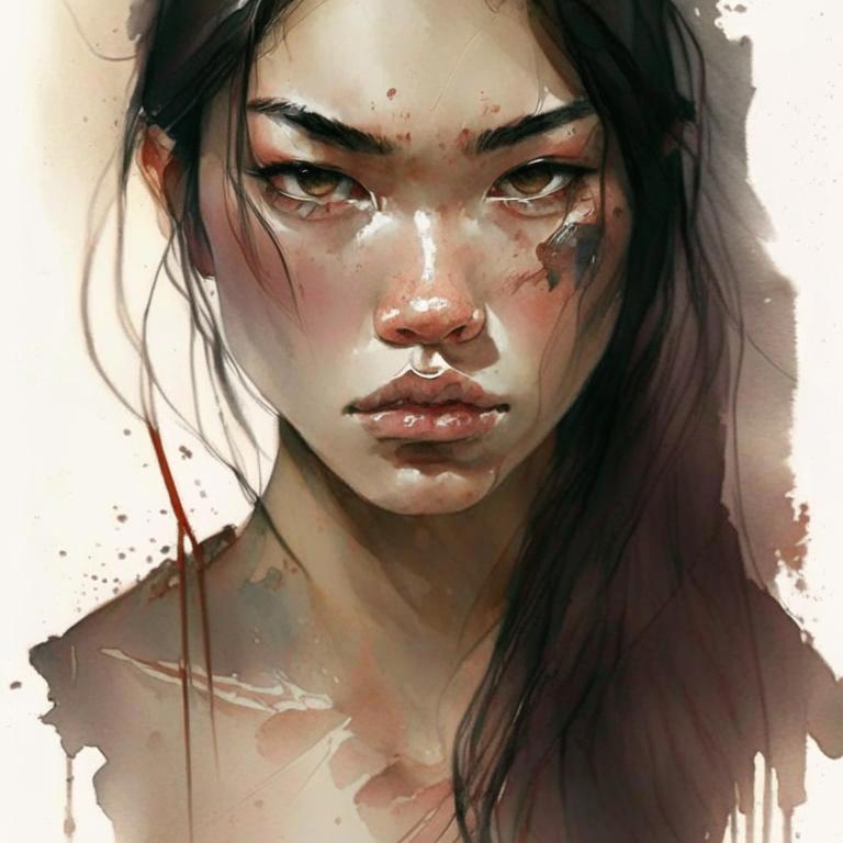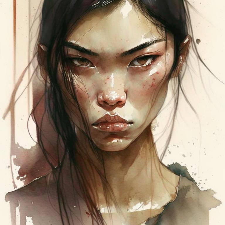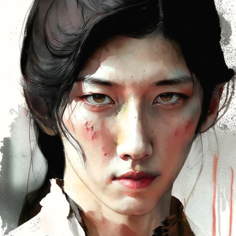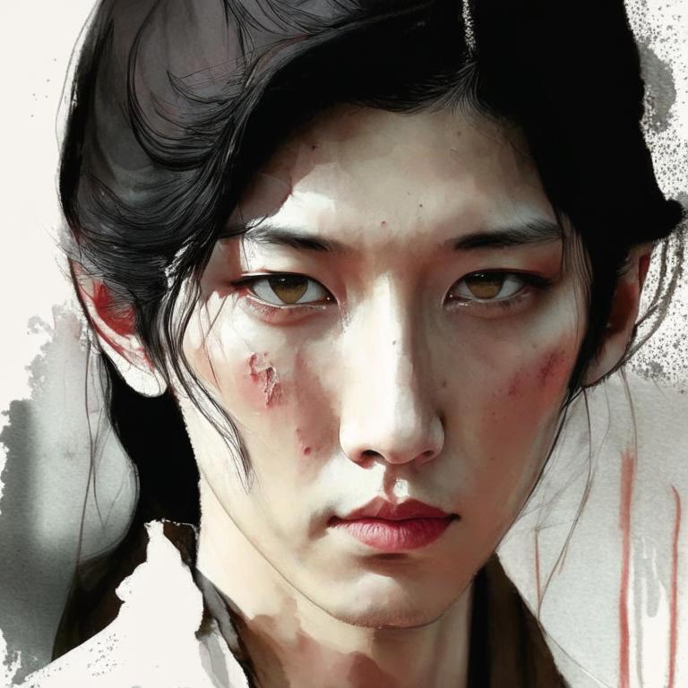 Текст: суровый брюнет, усталость, азиат-полукровка, кривая ухмылка, тонкие губы, тонкий прямой нос, акварель