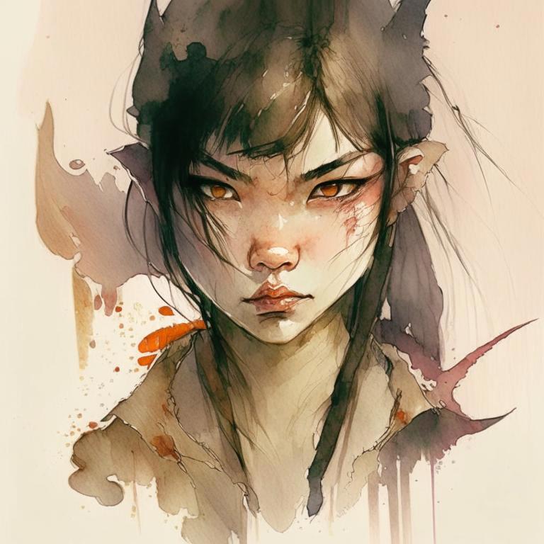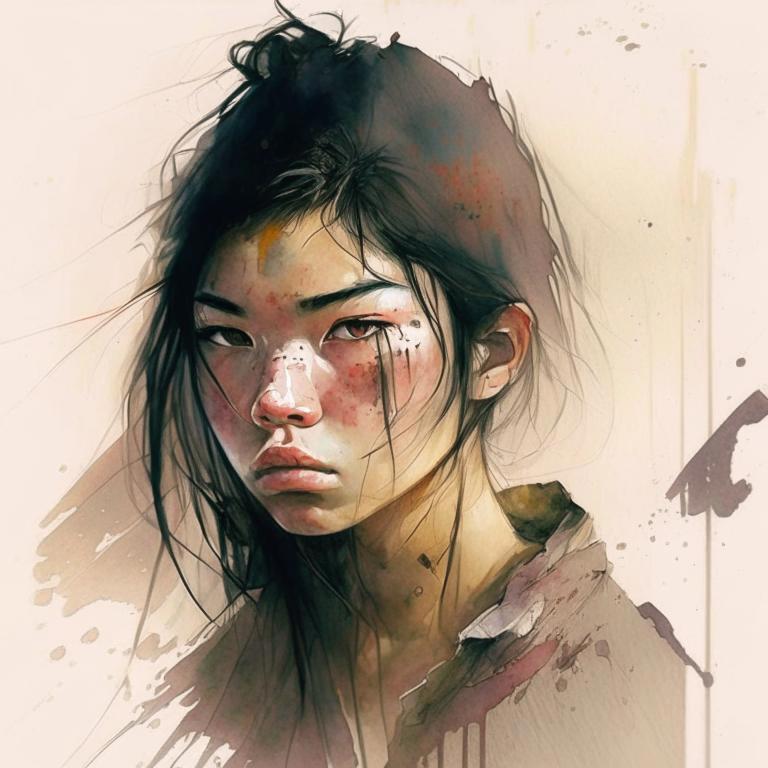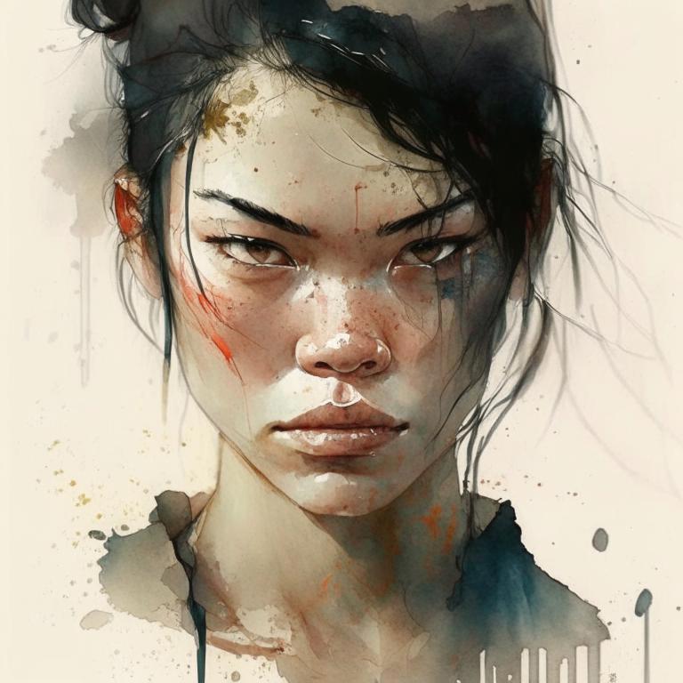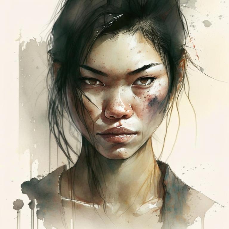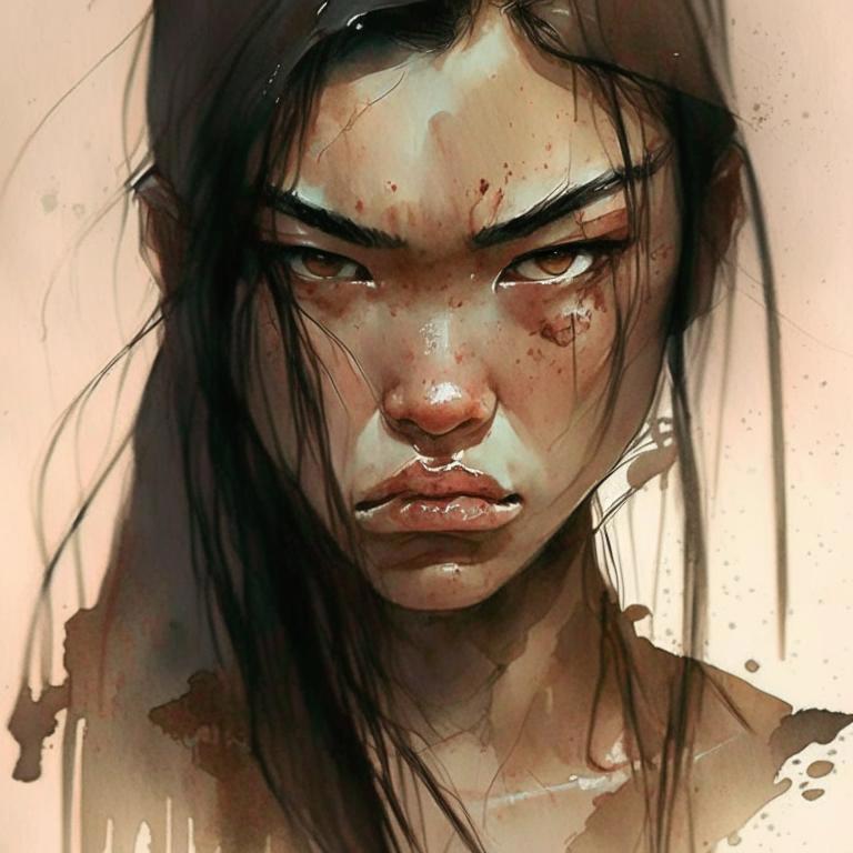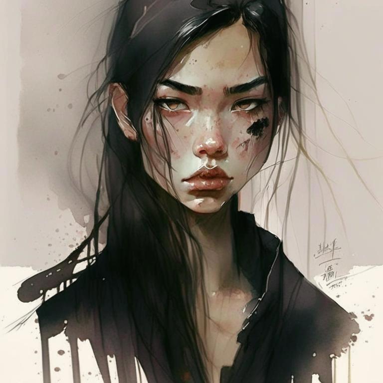 Текст: суровый брюнет, усталость, азиат-полукровка, кривая ухмылка, тонкие губы, тонкий прямой нос, акварель