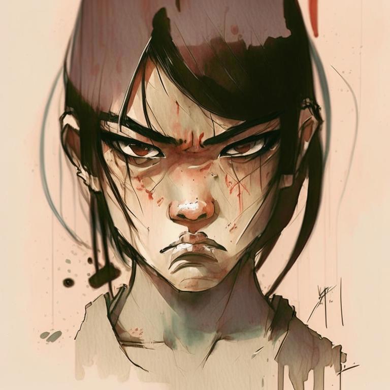 Суровый азиат-полукровка, тонкие губы, кривая ухмылка, тонкий прямой нос, злой взгляд, усталый брюнет, акварель. Стиль: anime