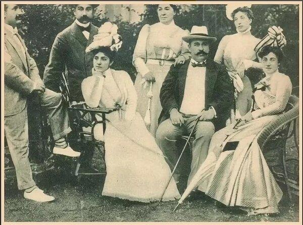 Потому что это семья покойного властителя Египта хедива Исмаила. Венценосное семейство сфотографировалось около 1898 года в Неаполе. Здесь его вторая и третья жены - сидят по центру и три его сына.