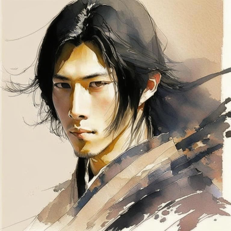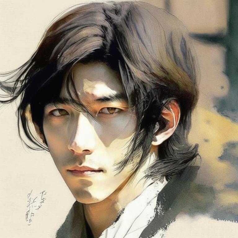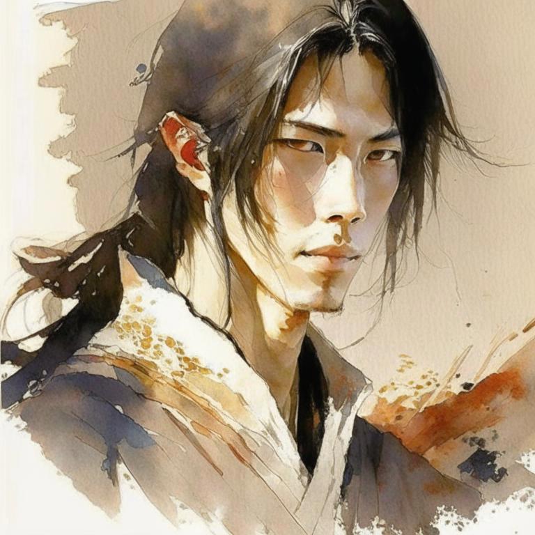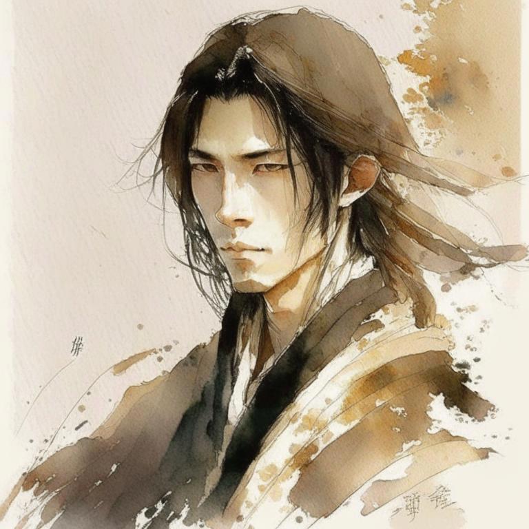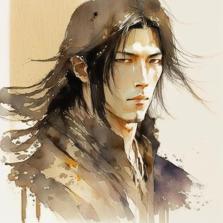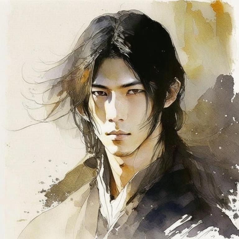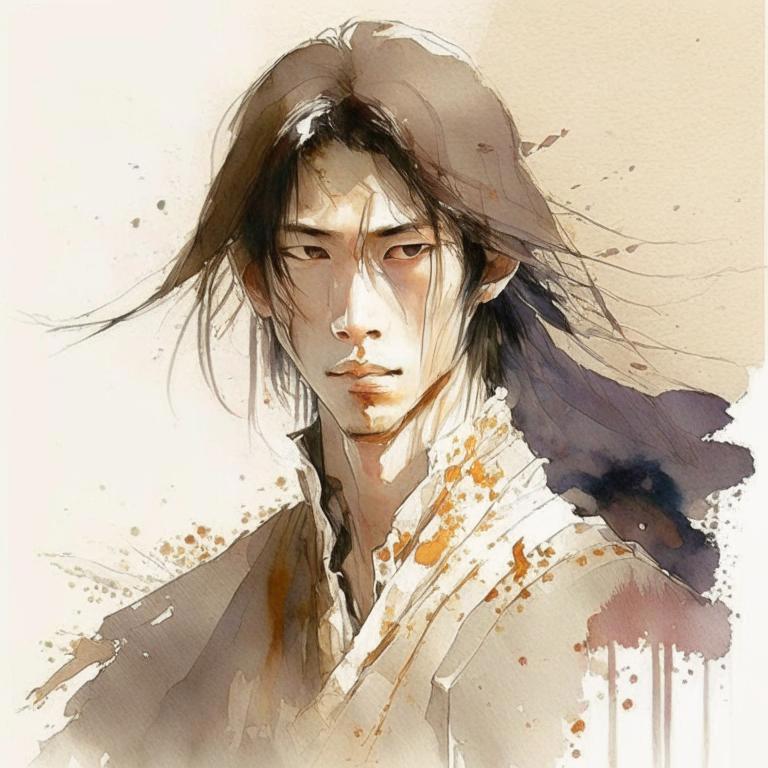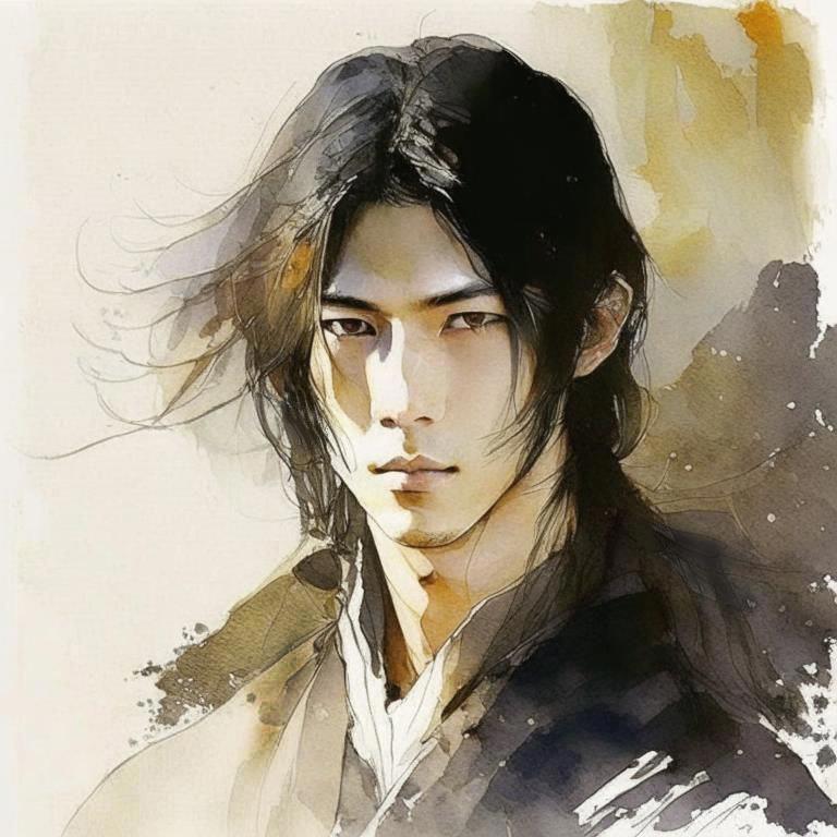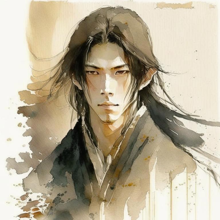 Мальчик, подросток, изящный азиат-полукровка, тонкие губы, кривая ухмылка, тонкий прямой нос, упрямый взгляд, яркие золотые глаза, безумная сумасшедшая улыбка, красивый брюнет, длинные прямые волосы, ветер, акварель, старый камень