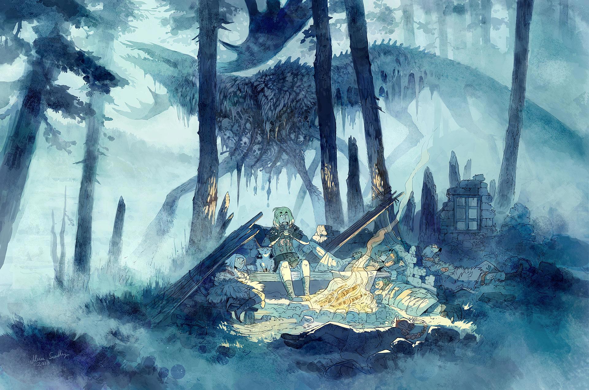 Зарисовка к комиксу Stand Still. Stay Silent. Внезапный посетитель у ночёвки в разрушенном доме. Мне очень нравится расположение команды вокруг костра.