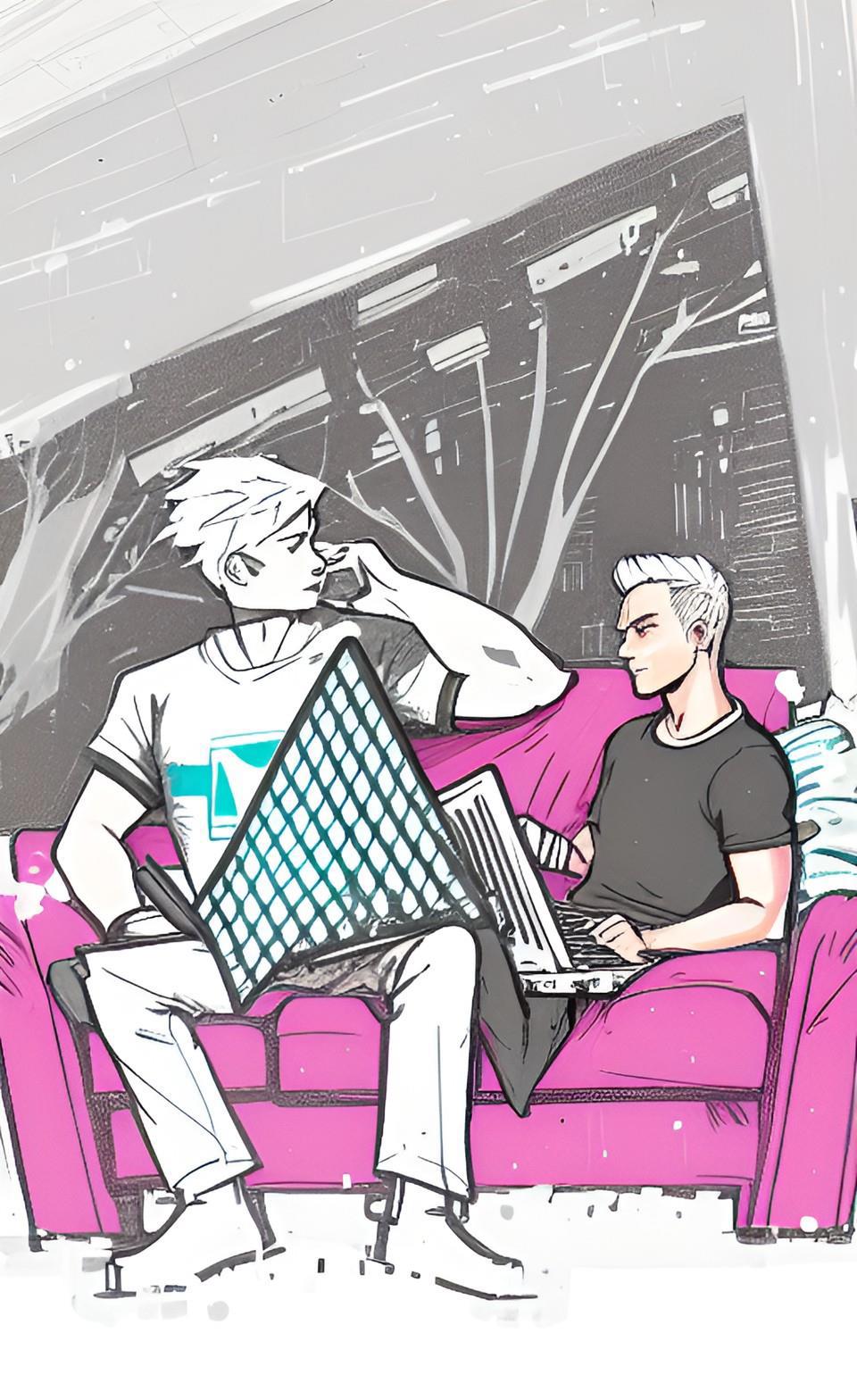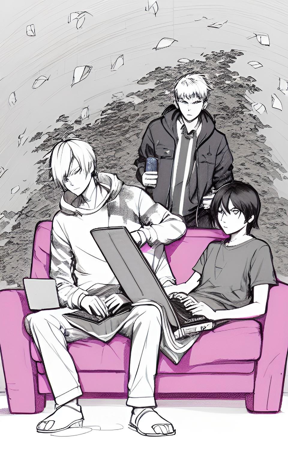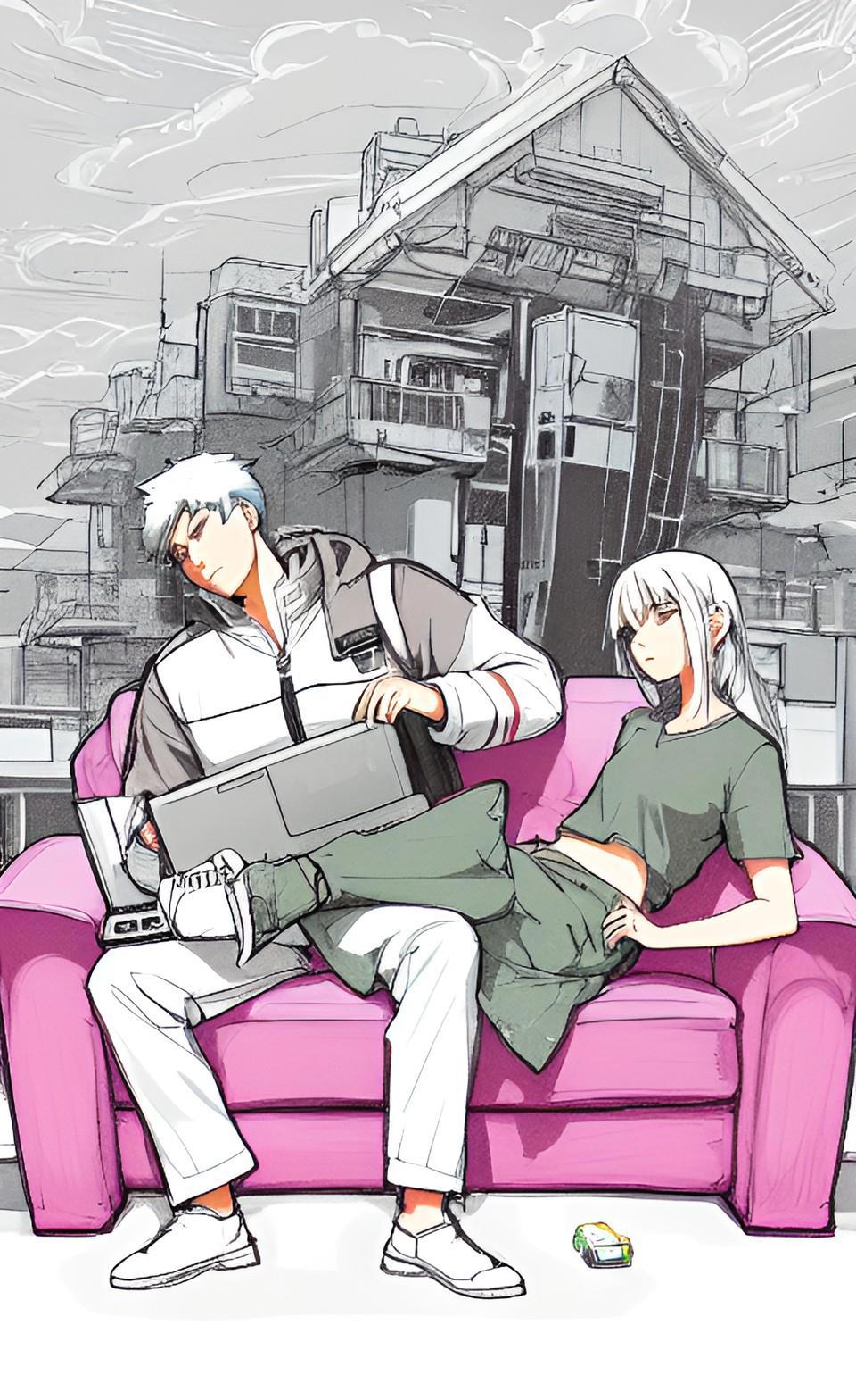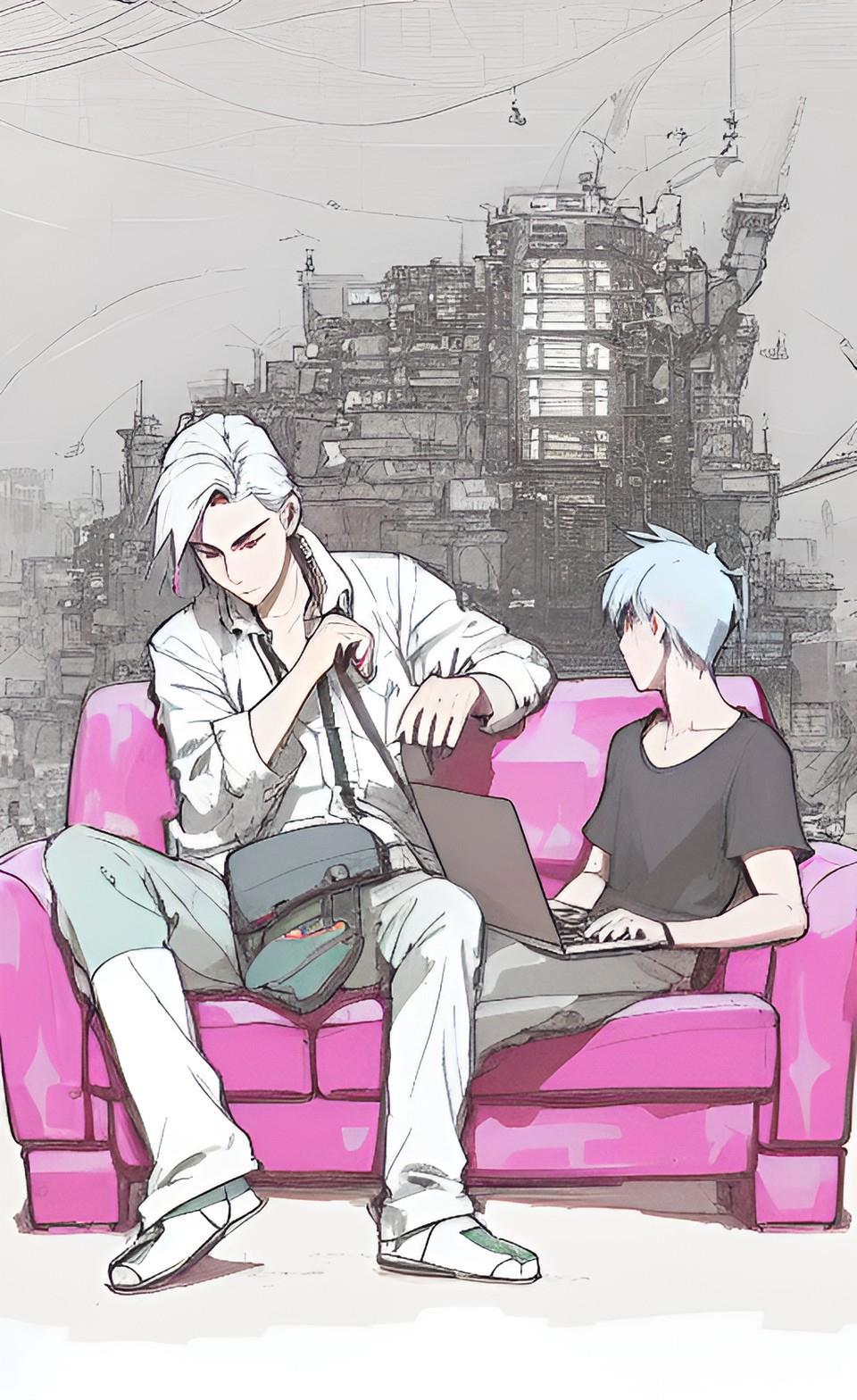 Словесный запрос звучал так: юноша-андроид с белыми волосами лежит на диване, укрытый пледом, с ноутбуком в руках и бьет босой ногой сидящего рядом парня в челюсть, сзади стоит телохранитель