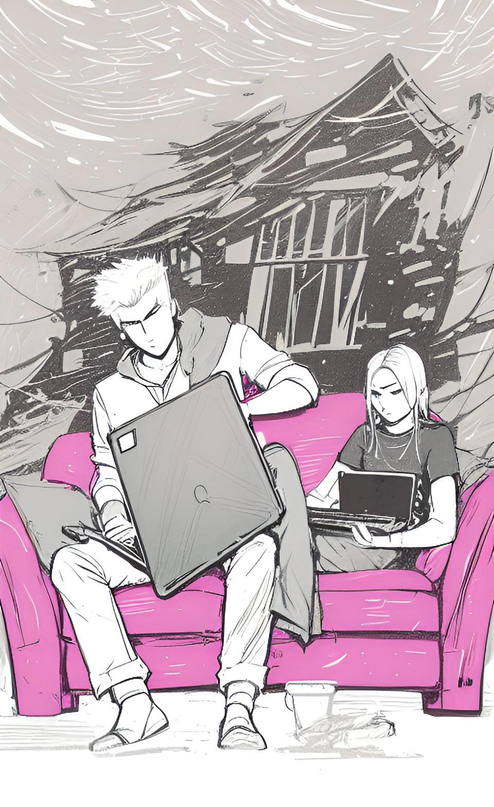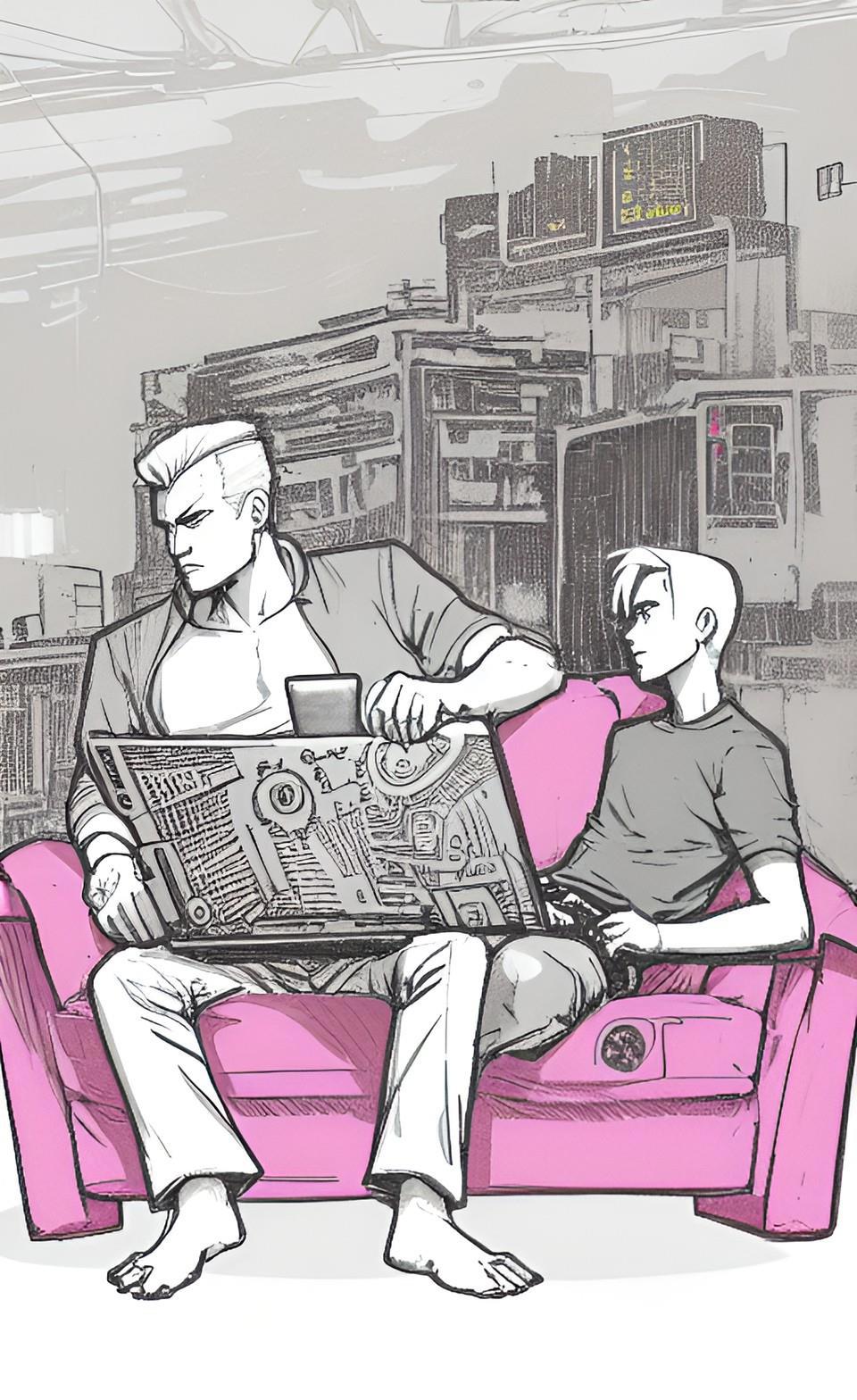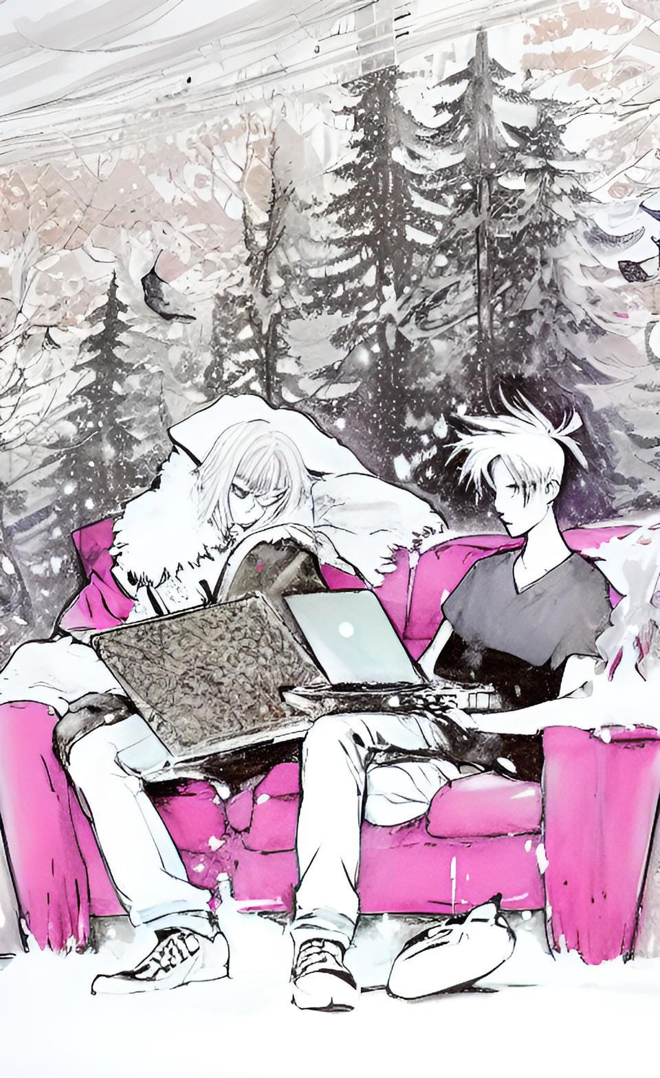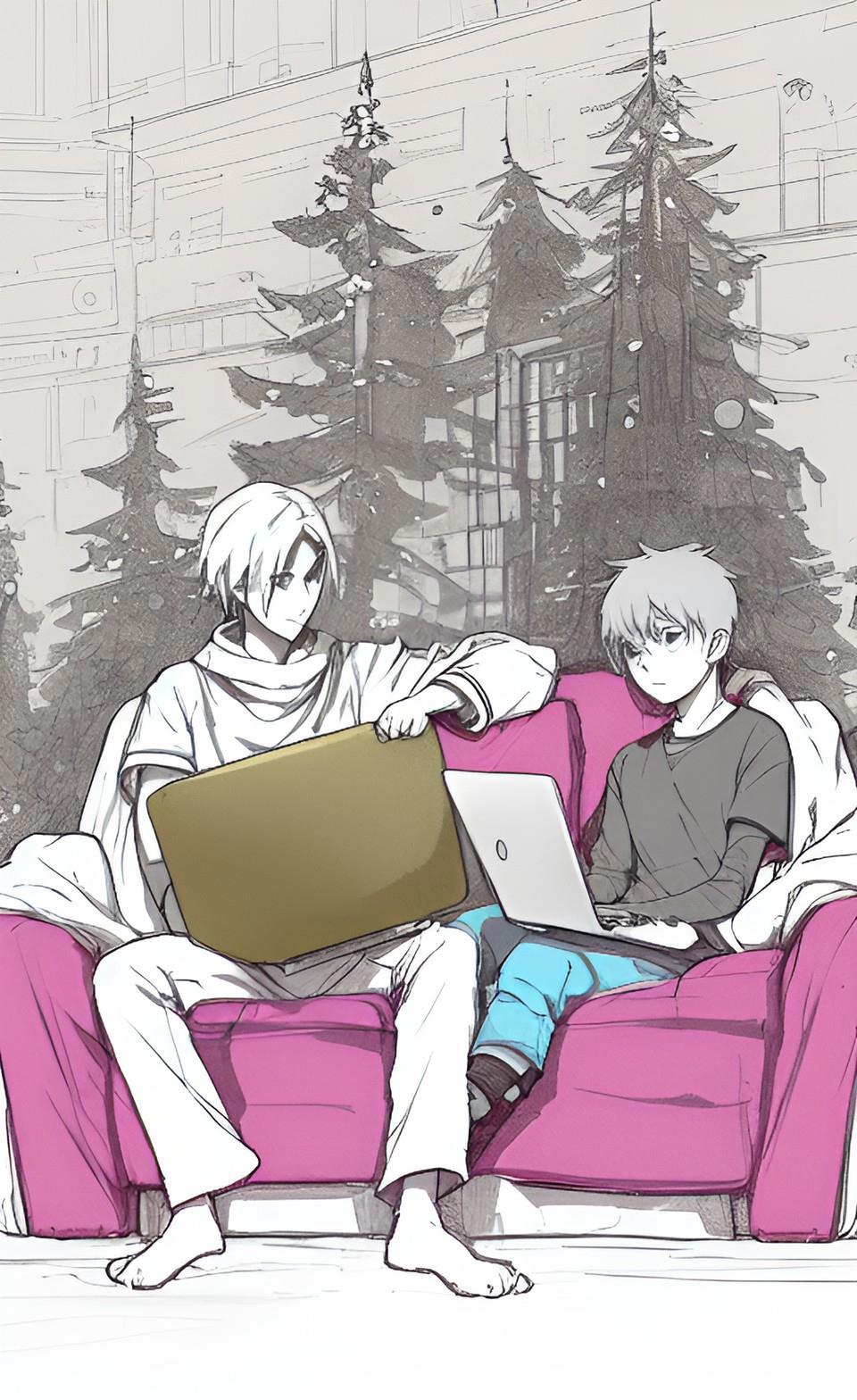 Словесный запрос звучал так: юноша-андроид с белыми волосами лежит на диване, укрытый пледом, с ноутбуком в руках и бьет босой ногой сидящего рядом парня в челюсть, сзади стоит телохранитель