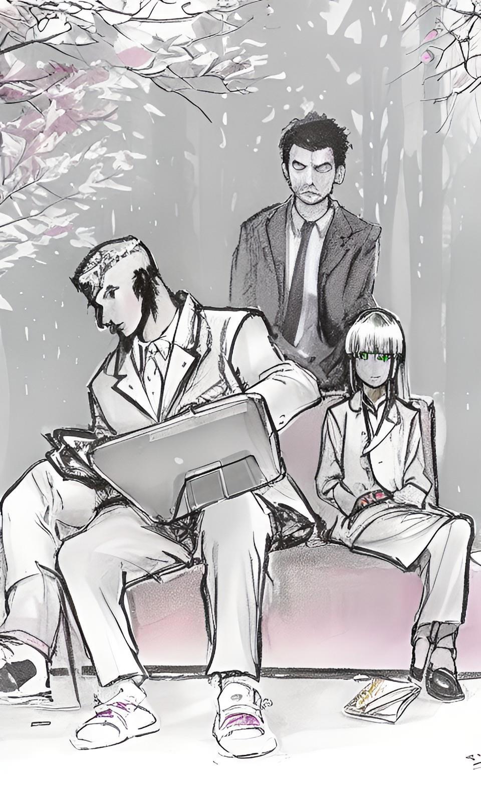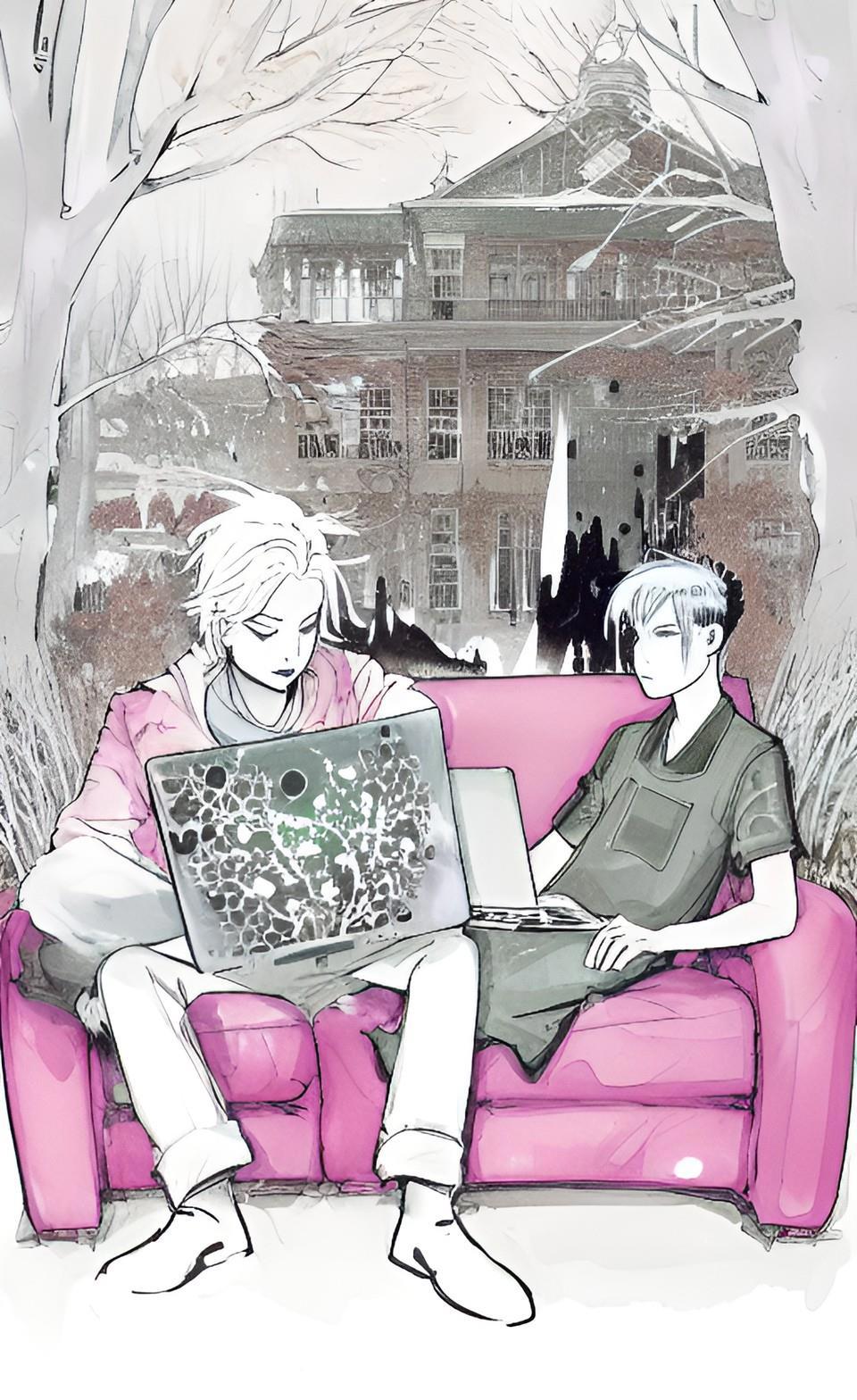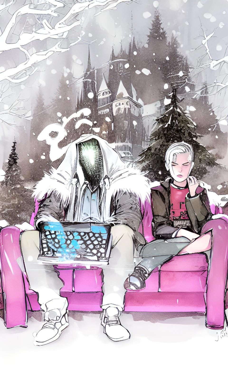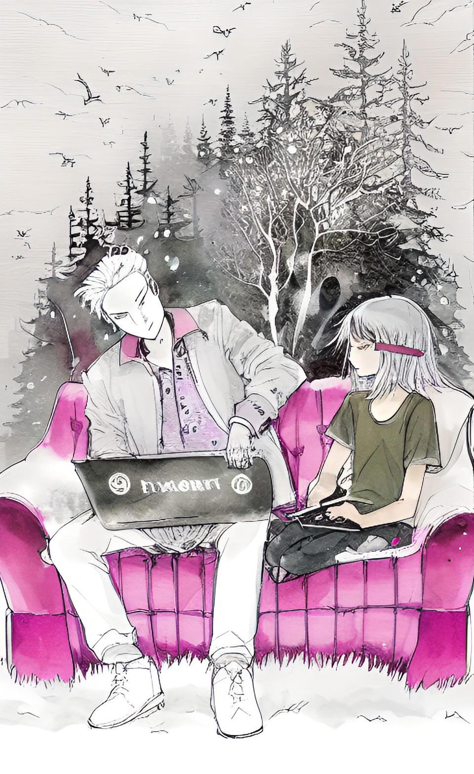 Словесный запрос звучал так: юноша-андроид с белыми волосами лежит на диване, укрытый пледом, с ноутбуком в руках и бьет босой ногой сидящего рядом парня в челюсть, сзади стоит телохранитель