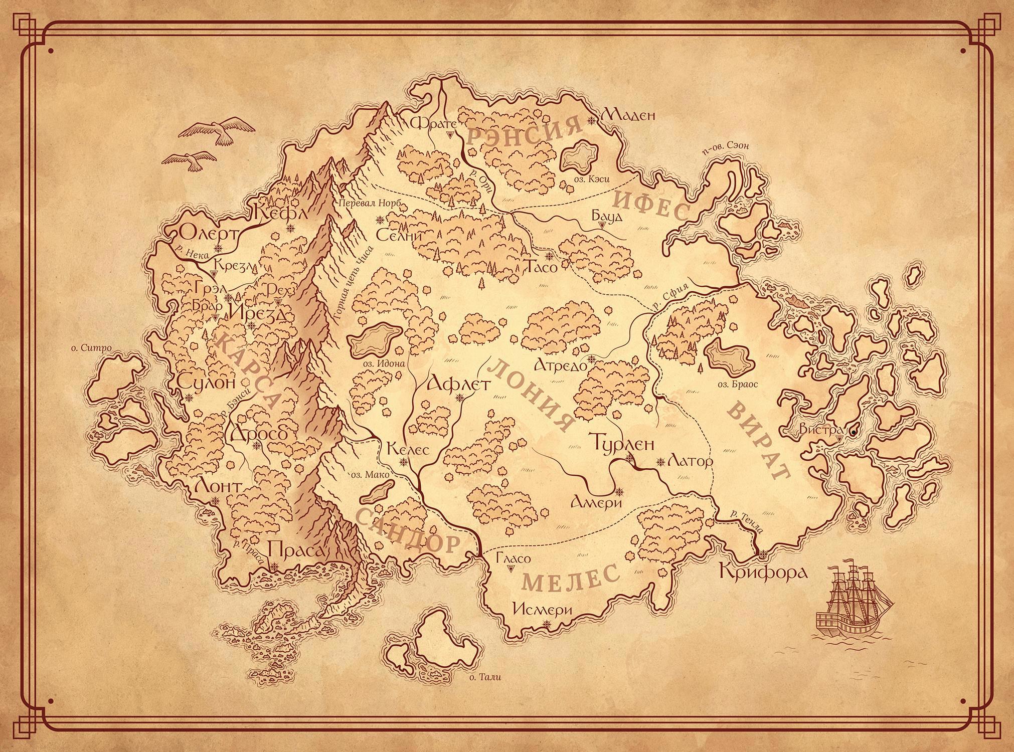 Конечно, мне захотелось нарисовать карту, близкую к оригиналу, который упоминается в книгах. То есть это должен был быть не просто рисунок с намётками рельефа местности, а карта в прямом её назначении, к тому же выполненная под старину. Я на самом деле обожаю состаренную бумагу, чернила, перья и вот это вот всё, а тут ещё и точно в тему, как доктор прописал, то есть как автор написал.