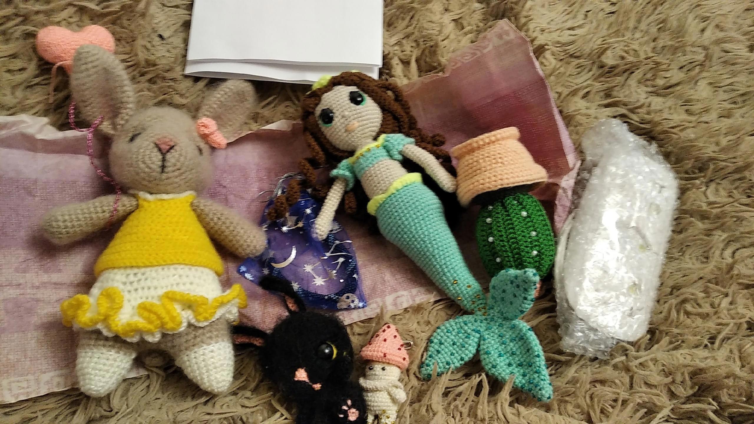Большой зайчик с настоящим воздушным шариком, маленький черный ушастик, синий браслет-жгутик в волшебном мешочке, кактус- игольница, грибочек-брелочек, настоящая русалка, трогательное письмо и УФ-лампа для моих будущих творений.