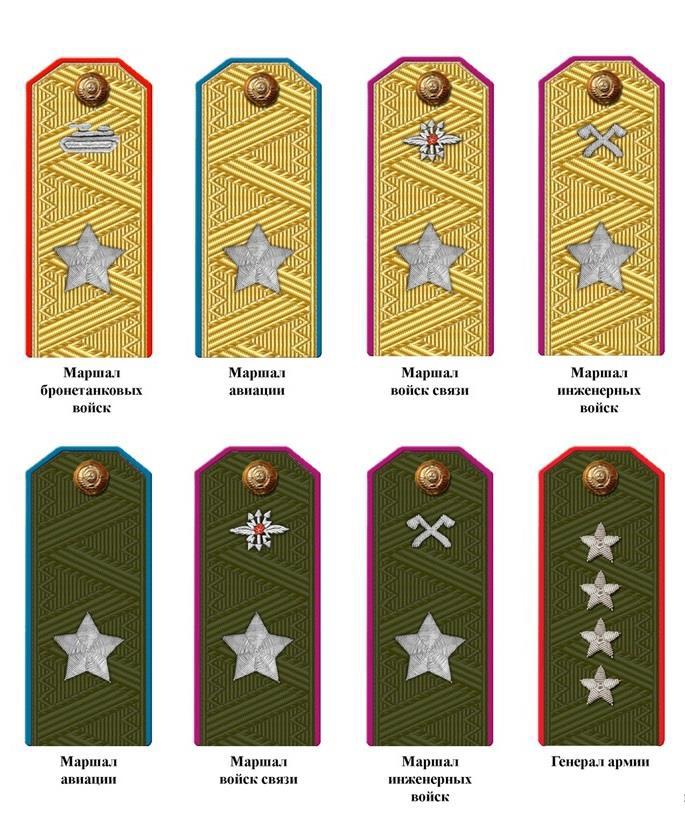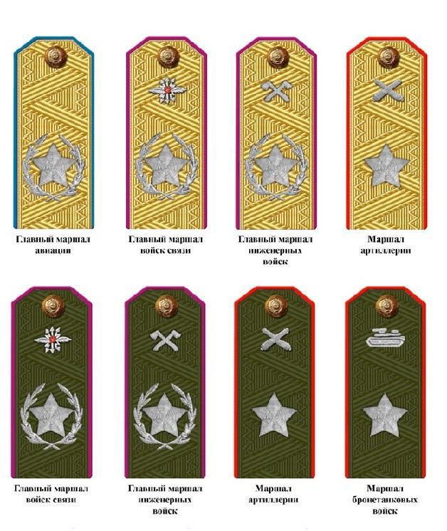 * Отменялись следующие воинские звания: маршал бронетанковых войск, главный маршал бронетанковых войск, главный маршал войск связи и главный маршал инженерных войск.