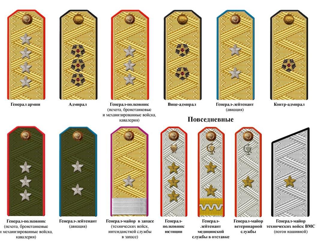 * Из воинских званий генералов родов войск (артиллерии, танковых войск, инженерных войск, войск связи и технических войск) исключалось наименование рода войск кроме артиллерии.