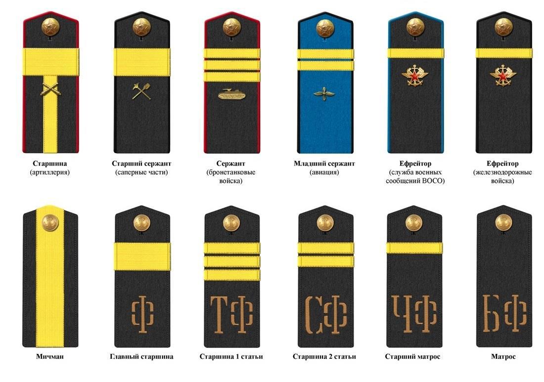 Погоны и петлицы на парадной и повседневной форме солдат, сержантов стали цветные с нашивками жёлтого (золотистого) цвета. Погоны цвета хаки с красными нашивками остались только на полевой солдатской и сержантской форме.