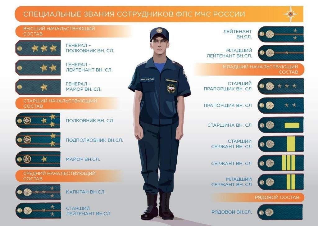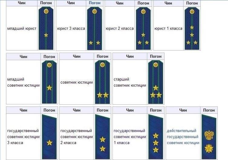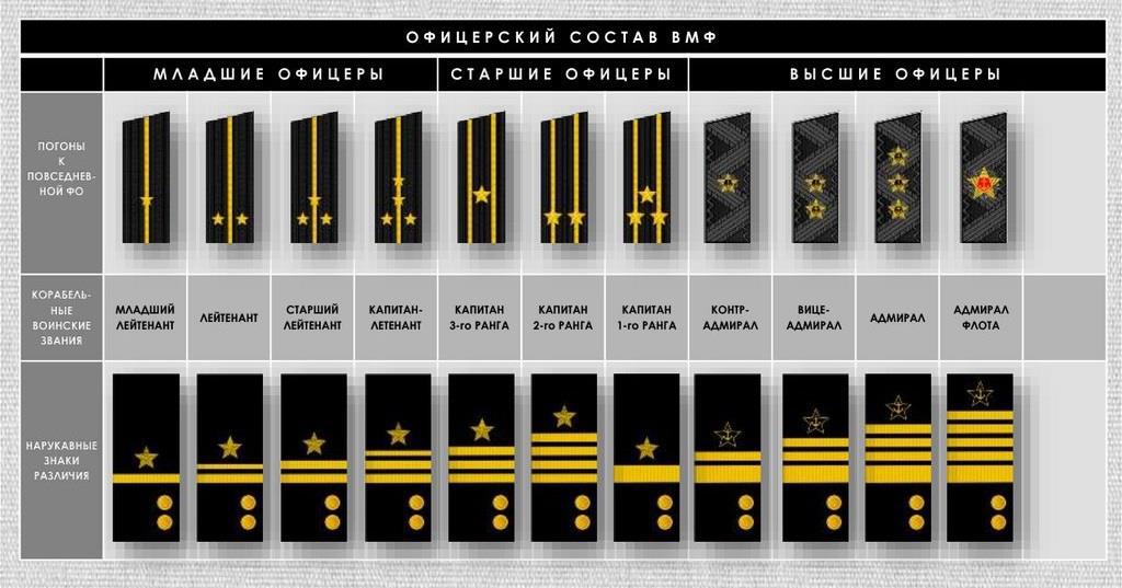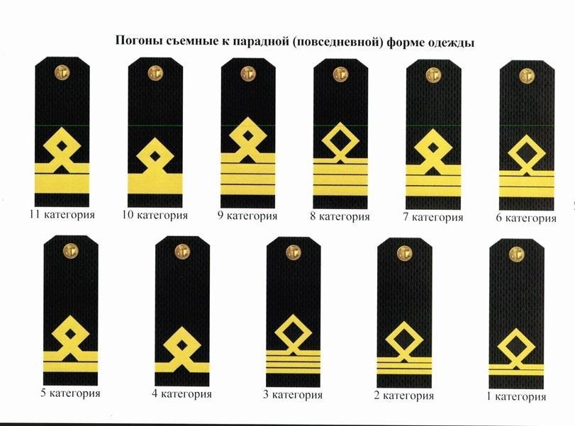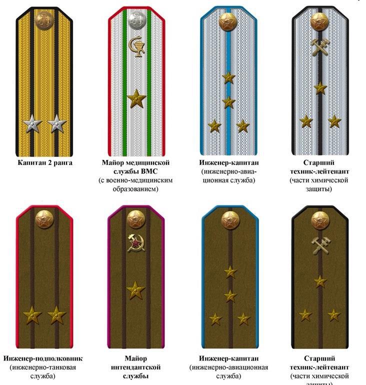Для младших и старших офицеров корабельного состава ВМФ и пограничных войск соответственно: лейтенант-инженер, старший лейтенант-инженер, капитан-лейтенант-инженер, капитан 3 ранга-инженер, капитан 2 ранга-инженер, капитан 1 ранга-инженер.