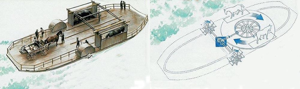 Конная беговая дорожка служила приводом для молотилок, мельниц, веялок, пилорамы, различных станков....Но кроме того была и силовой установкой на речном флоте и на портовых буксирах.