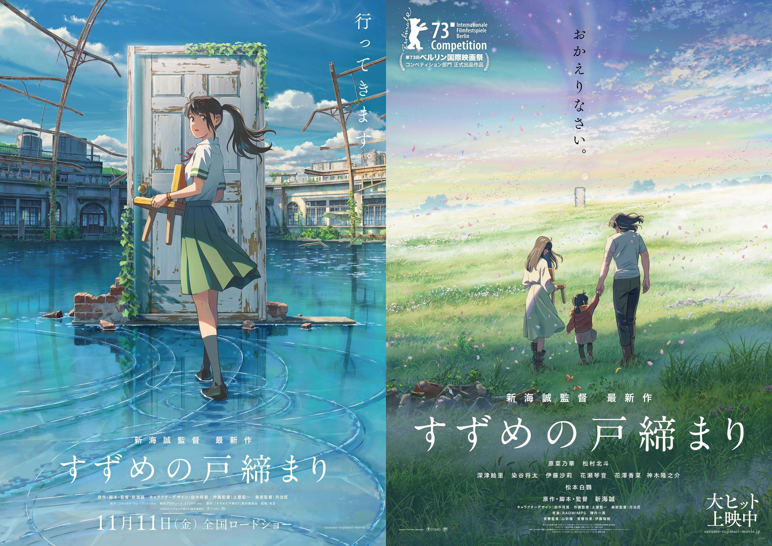 Первая— это история школьницы Судзумэ и Соты, студента, чьи предки из поколения в поколения закрывали двери, через которые прорываются катаклизмы. Судзумэ встречает по пути в школу, молодого, красивого путешественника, который ищет руины, находящиеся рядом. Последовав за ним, она видит дверь и открывает её, оживив при этом ками Дайдзина, ключ, который запирал механизм двери. Из этой двери начинается вырываться червь, вызывающий землетрясение, вместе с путешественником ей удалось закрыть её. Теперь им по воле случая придется их закрывать, чтобы спасти города Японии от землетрясений и цунами. Так вышло, что магическое создание Дайдзин, оживленный Судзумэ, заточил закрывателя дверей катаклизмов Соту в стул, переложив на него обязанности канамеси - краеугольного камня, запирающего механизм дверей катаклизмов. Судзумэ и Сота-стул отправляются в путешествие по Японии с целью закрыть все двери катаклизмов, через которые в города проникали Мимидзу - черви-предвестники катастроф и заставить Дайдзина вернуть Соте человеческое тело.