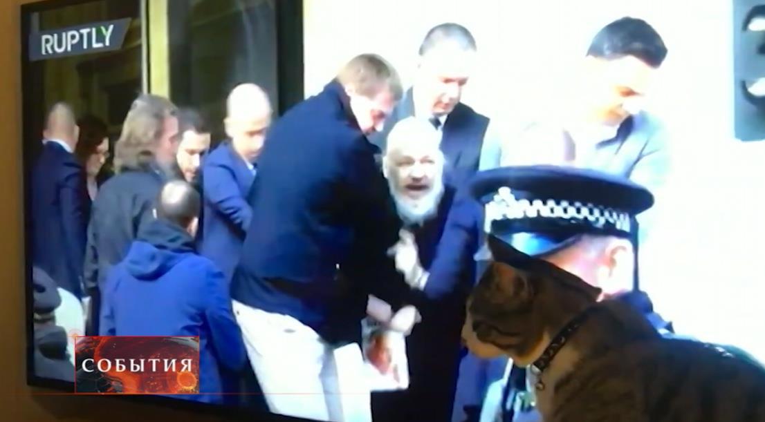Кот Джулиана Ассанжа смотрит трансляцию ареста своего хозяина. Опубликовано командой Викиликс.