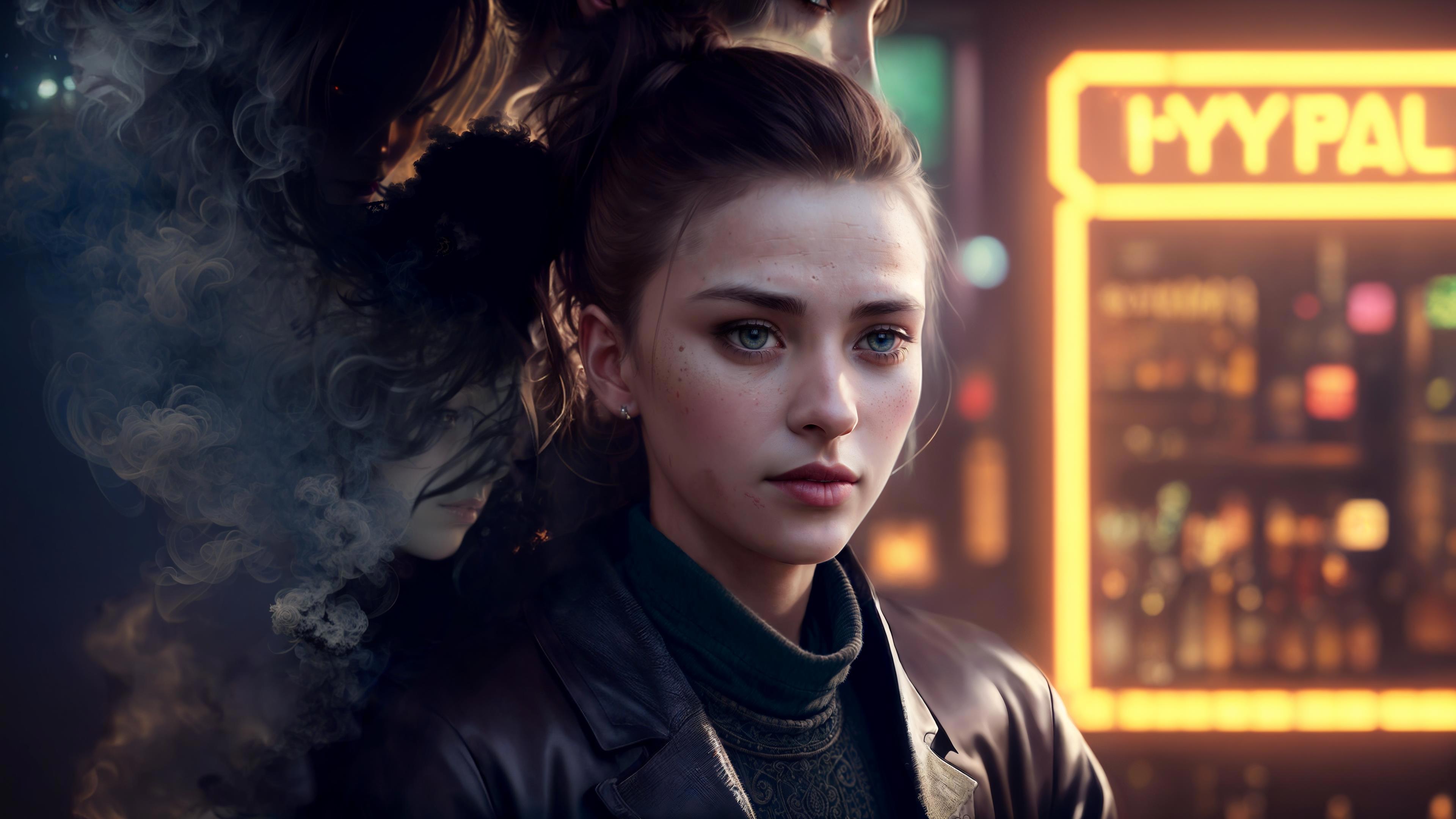 Но это ещё не всё. Вернёмся к бару к предыдущему изображению. Мне понравились попытки в концептуальность. Не просто делать портрет персонажа, а вкладывать идею в арт. Пусть даже иногда идея вкладывается нейросетью посредством случайности. Кто я такой, чтобы спорить? Положимся на рандом нейросети, хех.