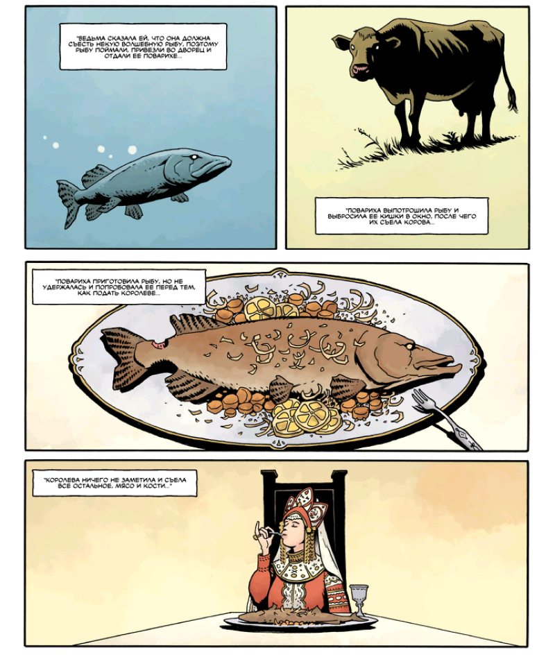Хочется отметить, что проработка сказочного русского материала - на пятерку. В сквозной истории угадываются несколько сказок. Сюжеты отлично подобраны, пересказаны, сплетены и отображены визуально.