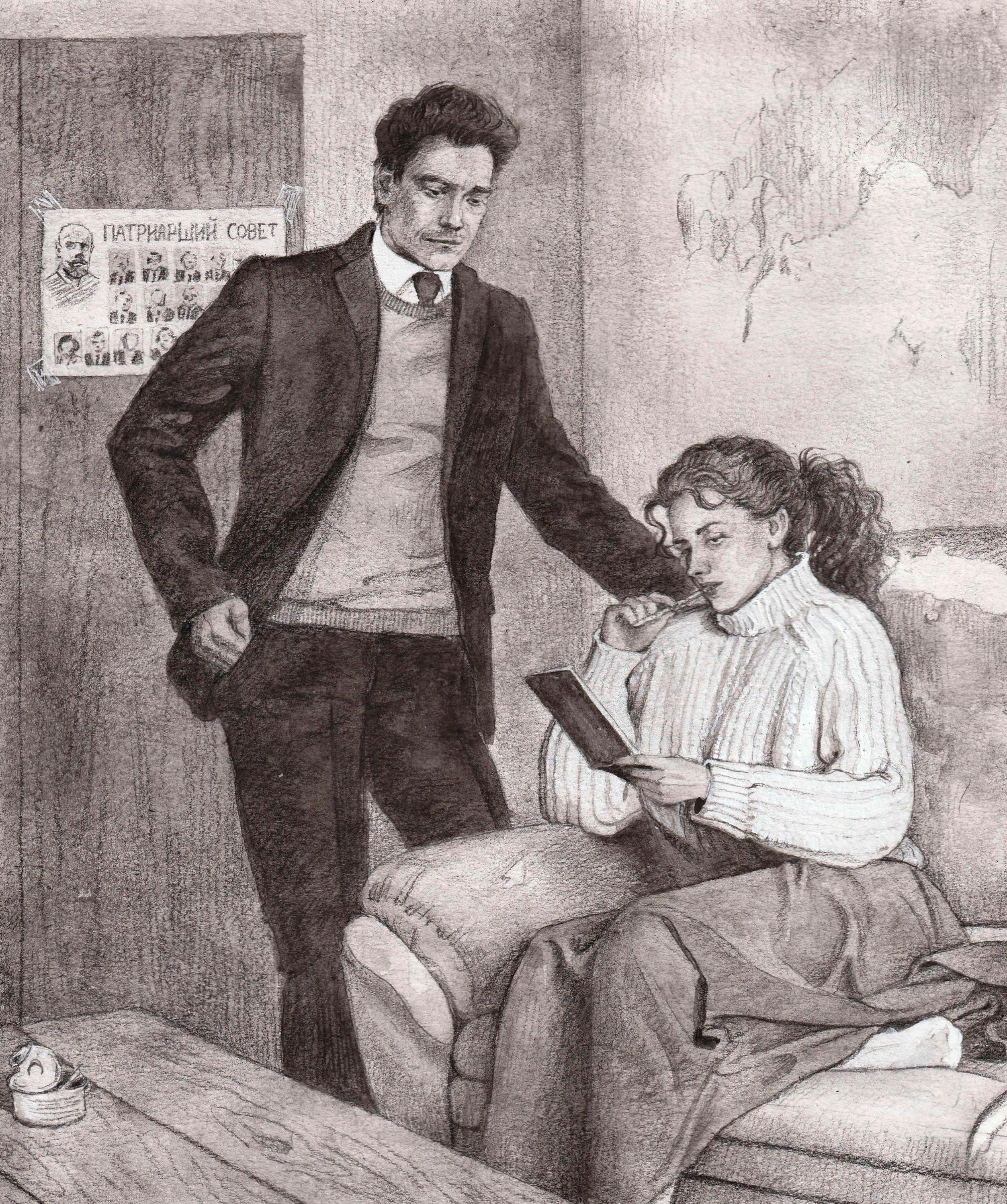 Здесь Макс ощущал себя словно в старой профессорской квартире, где неизбывный бардак стыдливо именуют творческим беспорядком, но каждая пылинка несёт на себе отпечаток целой эпохи. Массивный дубовый стол времён Распутина, изрезанный перочинными ножиками вдоль и поперёк, не менее древний диван с потрескавшейся обивкой — сюда, похоже, стаскивали хлам со всего факультета. Но сколько первозданного очарования в этом хламе! Даже современный плакат с портретами членов Патриаршего Совета не казался чужеродным. Здесь, под властью рыжеволосой наяды, в единый эон сплелись все века — и былые, и грядущие.