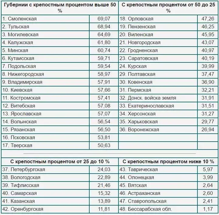 Данные из: Тройницкий, А. Г. Крепостное население в России по 10-й народной переписи; в (пропущенной) Московской губернии было примерно 39% крепостных, в Архангельской губернии крепостное население отсутствовало.