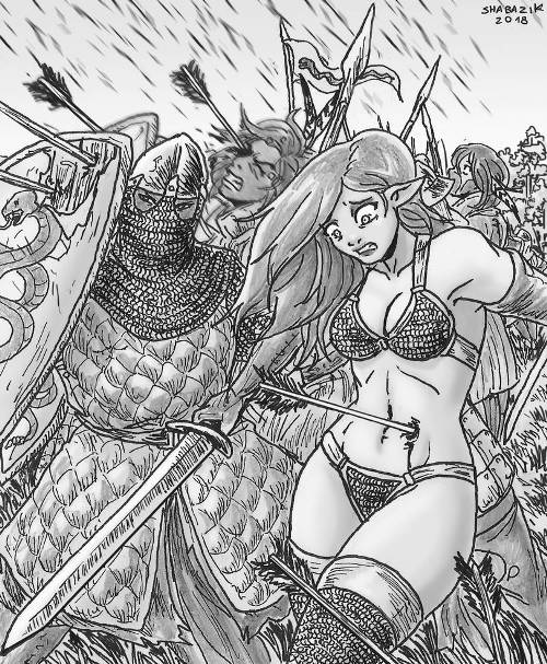 Предположим, что перед нами очередной мир Меча и Магии, по дорогам которого бродит наша полуголая героиня. И нет ничего удивительного, что в один прекрасный момент с ней внезапно столкнутся личности, которых она безусловно может назвать своими врагами. Начинается бой, враг торжествующе проводит обманный прием, наносит удар ни в чем не защищенную грудь и тут...