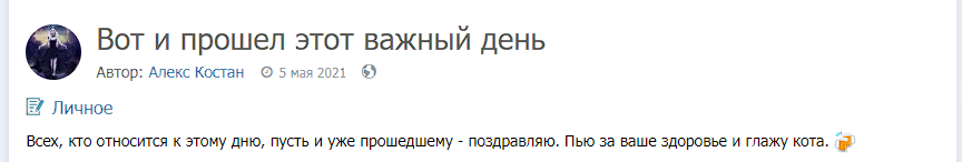 Всех, кто относится к этому дню, пусть и уже прошедшему - поздравляю. За ваше здоровье больше не пью, а вот кота как обычно глажу.