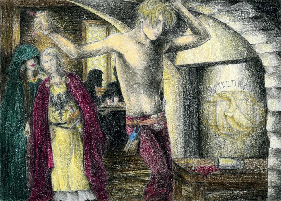 Словом, так или иначе, герои "Цветов для наглых" пьют все – правда, до откровенного пьянства доходит не всякий раз, умеренность все-таки считается добродетелью. Но, с другой стороны, как удержать себя, если ты весел на пиру или наоборот, хочешь затушить горечь разочарования и злобы?..Сразу после вечерней трапезы Лео отослал слуг, надеясь, что Анастази пожелает увидеться с ним. Но свидания не случилось, и менестреля охватили те же тоска и беспокойство из-за предстоящей разлуки, с которыми тщетно боролась королева.