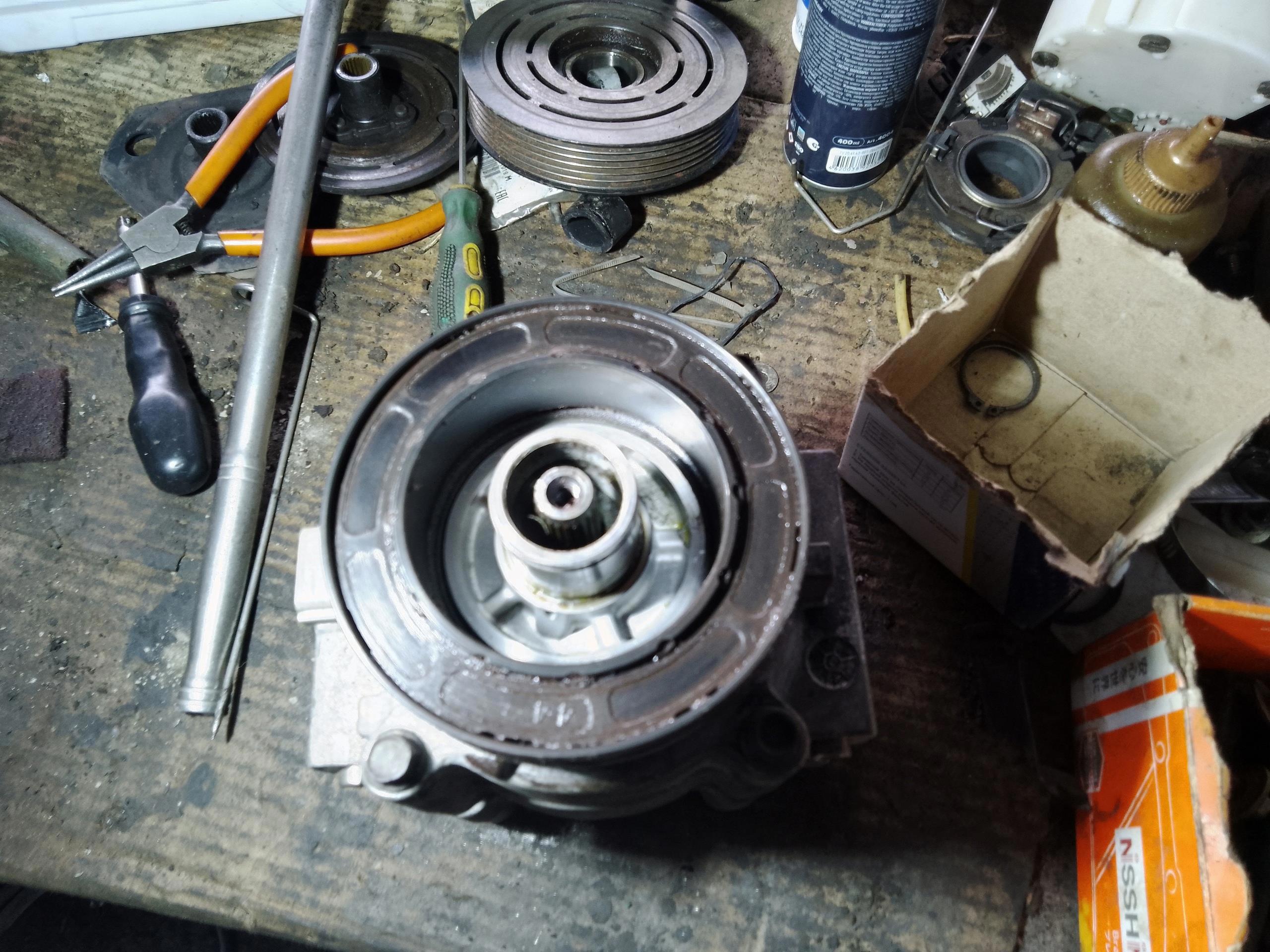 Следующий на очереди - Мазда Трибьют со своим карданом и кондиционером. В прошлый раз владелец свозил кардан к балансировщикам, и они приговорили обе крестовины, а так же отправился разыскивать компрессор кондея, и нашел только к началу этой недели. Правда, косяк в том, что снятый компрессор наелся воды и заклинил. Зато! На нём был целый магнит и шкив с прижимной пластиной.