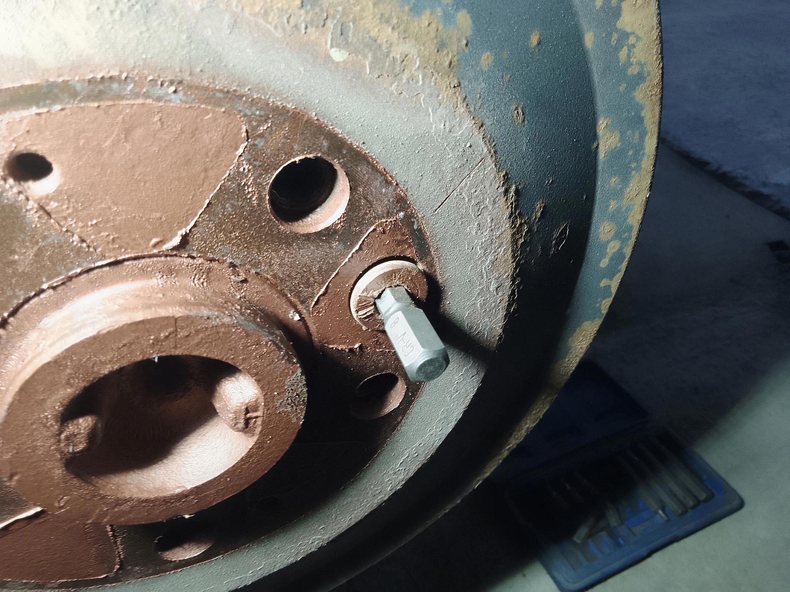 Ставлю колесо, и иду на правую сторону. Вот тут-то я и понял, чего клиент так переживал! Правое заднее колесо отказалось вращаться, тормоз заклинил. Попытки сдёрнуть барабан не увенчались успехом, ослабленный трос ручника не помог. Механизм разведения отказался крутиться. "Подстава!" - подумал я, и пошел за монтировкой. Приложение варварской силы и такой-то матери дало результат - барабан снят. Механизм разведения пострадал, зато были обнаружены "солдатики" длинной в ногу, сделанные похоже из гвоздя. А чтоб колодка не болталась, с обратной стороны "солдатиков" было надето по три гайки. Это всё привело меня в некоторое недоумение, из которого пришлось выйти, чтобы выправить механизм разведения, который по итогу был заказан новый, вместе с комплектом "солдатиков". Так же были обнаружены следы масла, и сальнику полуоси вынесено подозрение.