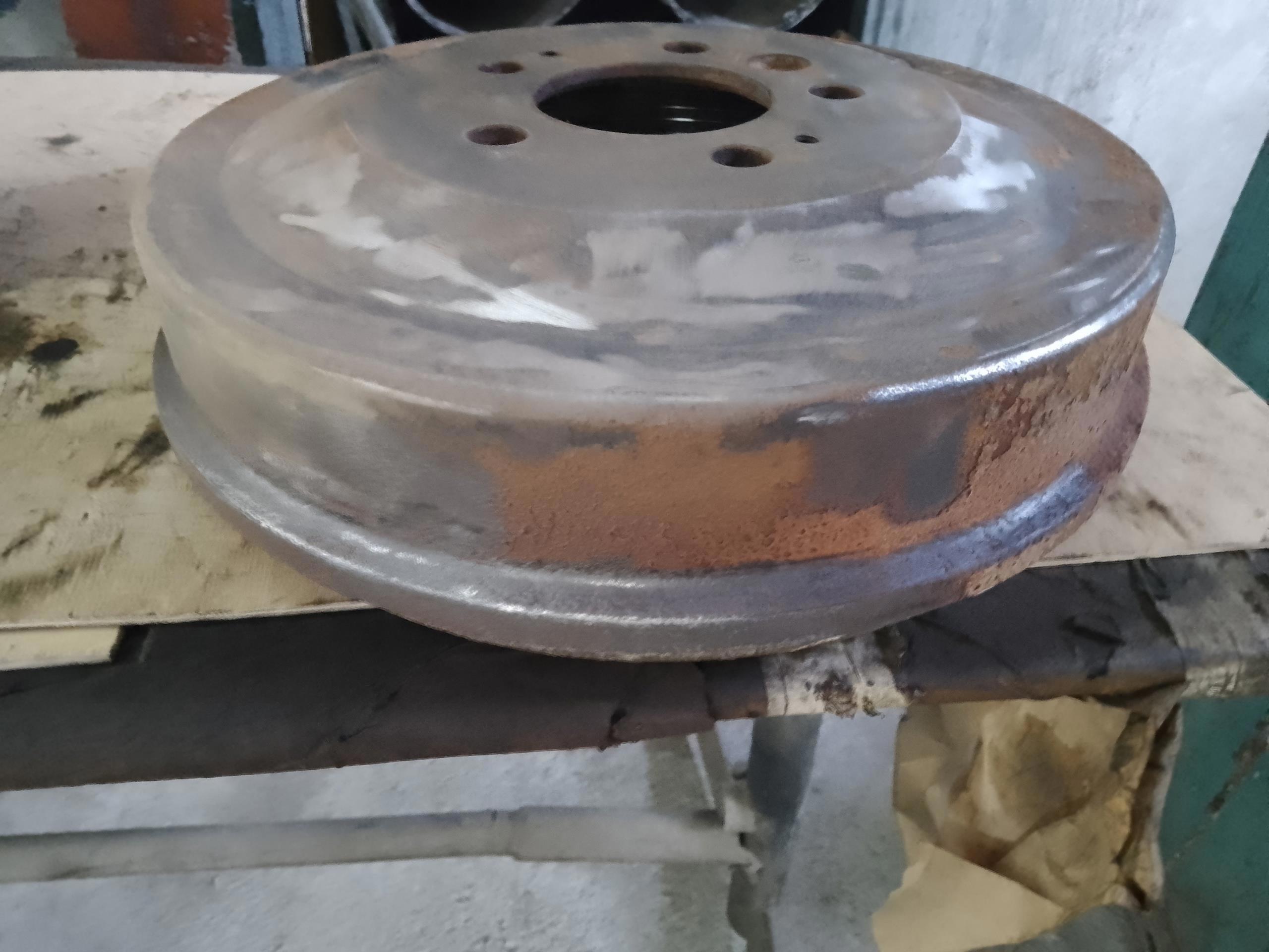 До того, как заняться колодками, решил покрасить барабан. Поцарапав ржавчину щёткой, понял, что состарюсь раньше, чем отшоркаю хотябы один барабан, и вспомнил, что у директора был коралловый круг для болгарки. Коралл хорошо отдирает ржавчину и краску, зато практически не воздействует на металл. То, что надо!