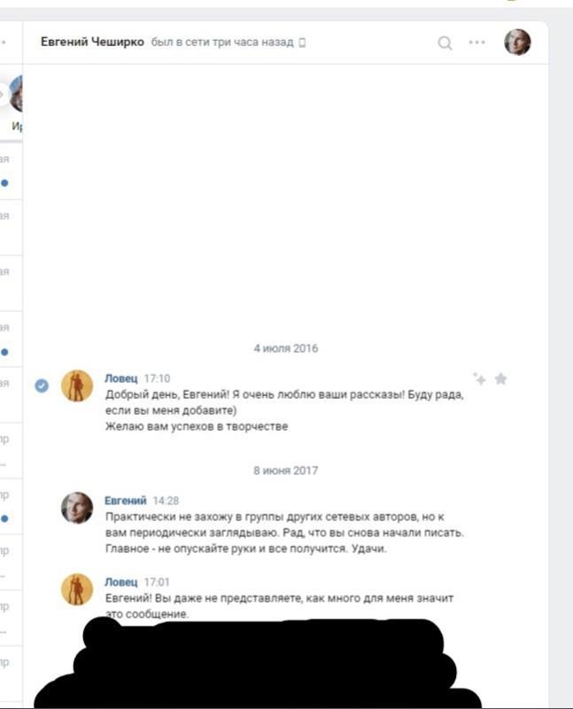 В 2016-м свои рассказы я выкладывала в группе, где выпускали рассказы разных авторов, а читатели их читали и комментировали. Хорошее было время! Там печатались Чеширко и Котобус и Чеширко, !кстати! написал мне лично, что я пишу прям хорошо. Я скрин найду, ниже размещу.