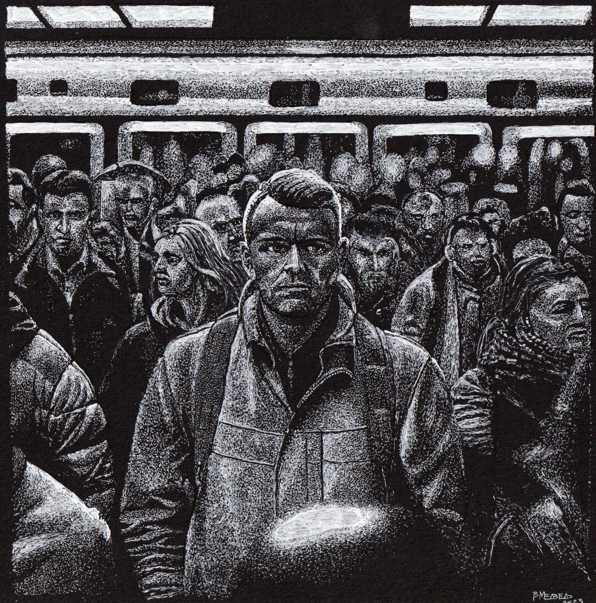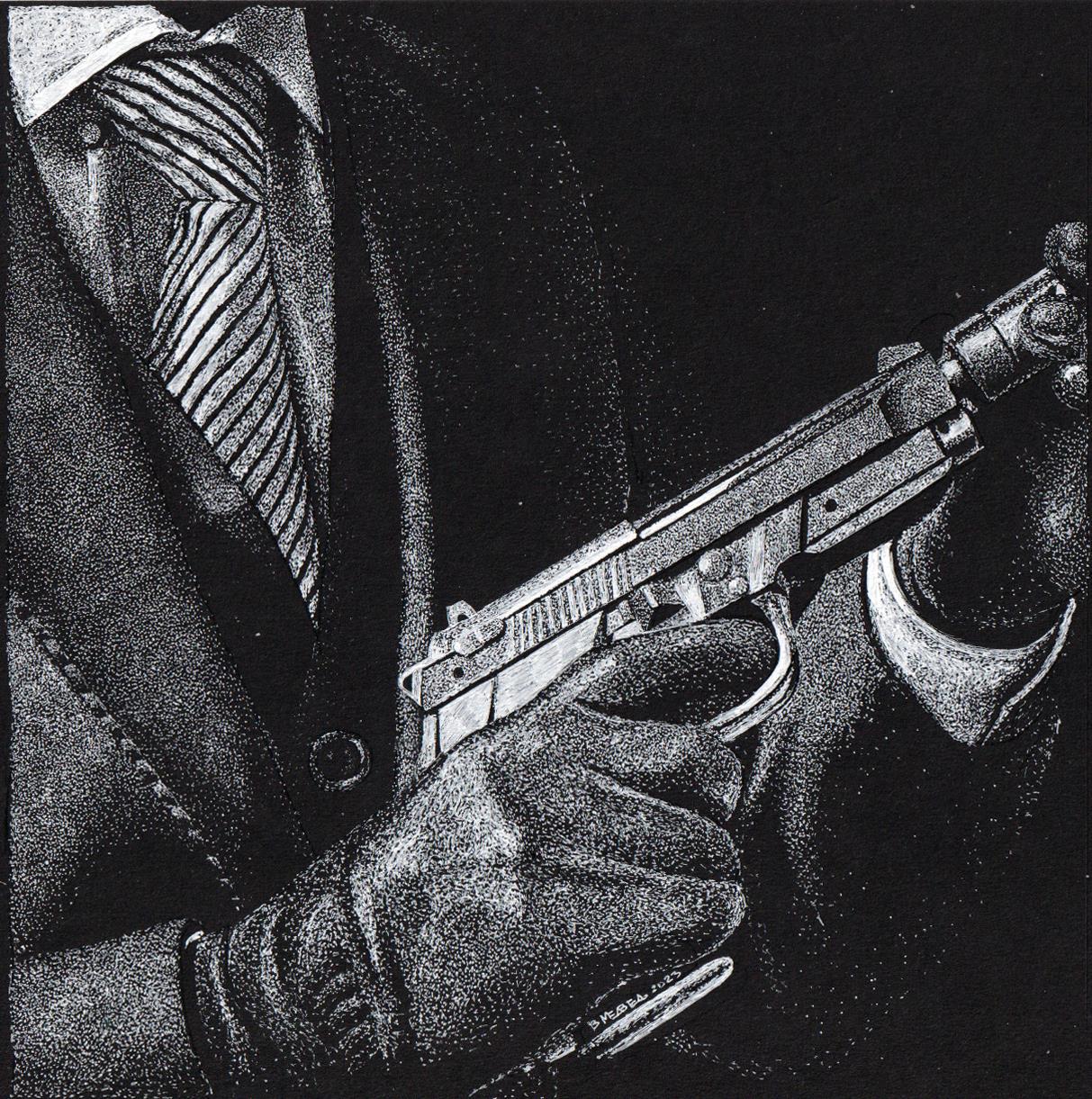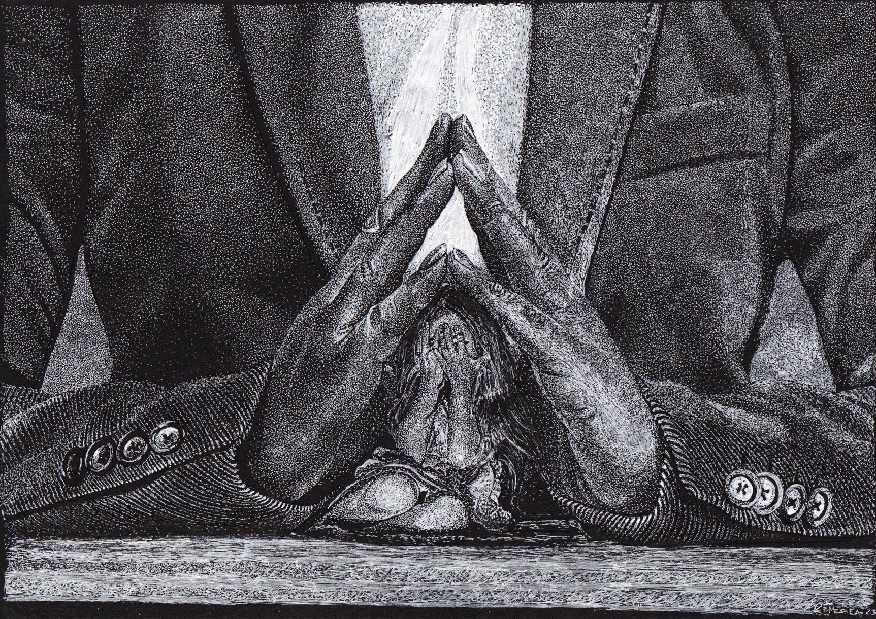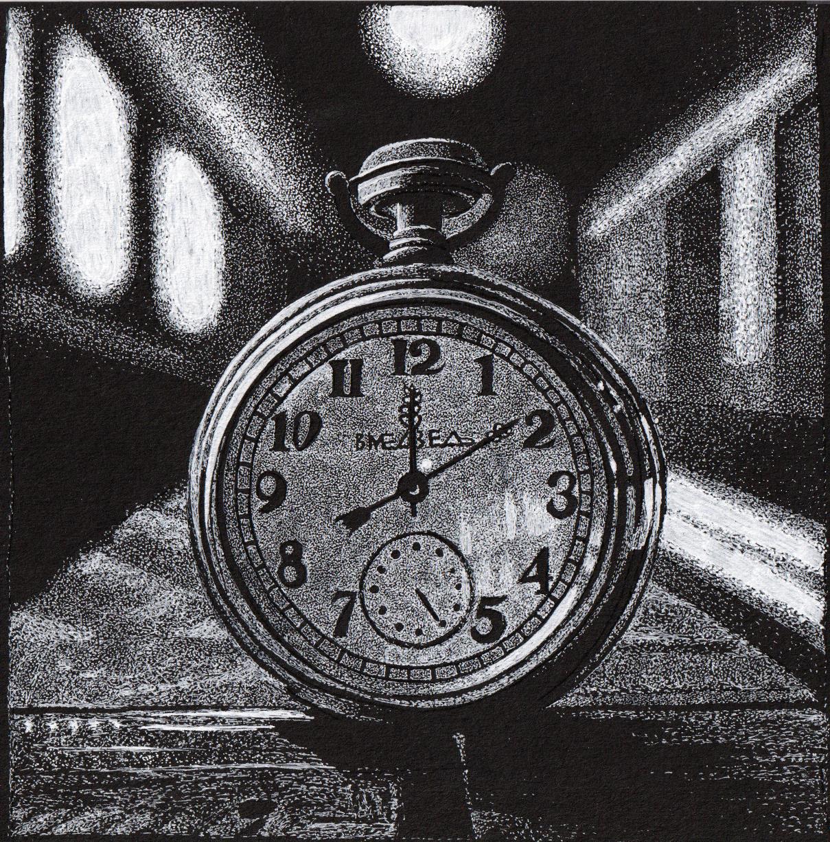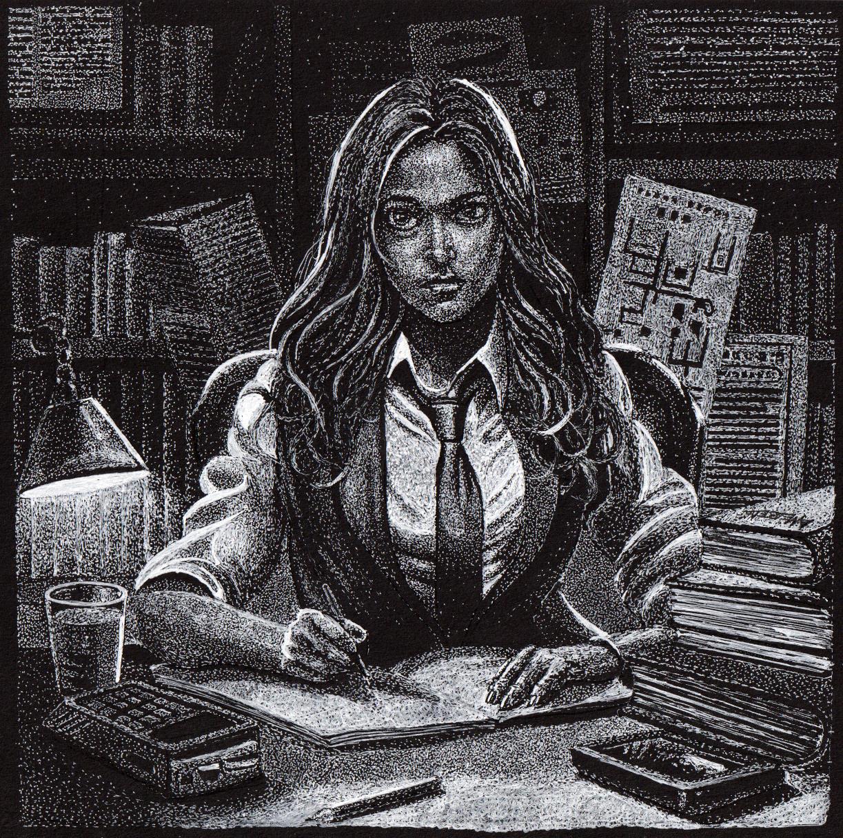 Придумав концепцию, я взялся быстро-быстро рисовать иллюстрации, практически влобовую отображающие сцены из повествования. Всего вышло пять штук. Из-за ограниченности во времени рисовать пришлось на малых форматах (А4 и меньше), что привело к появлению неприятных артефактов.