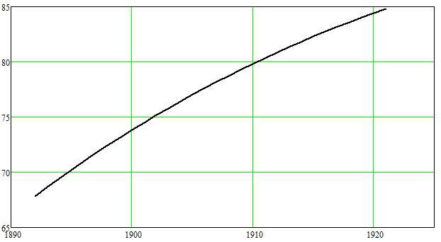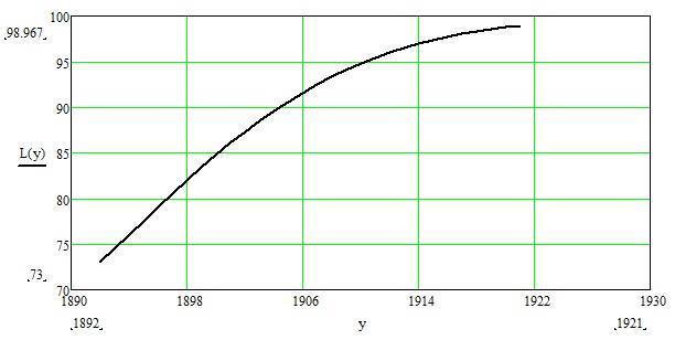 Если рассчитать средний темп ликвидации неграмотности (по данным Рашина) за 1903-1913, и принять допущение, что темпы ликвидации неграмотности для периода 1903-1913 (то есть для новобранцев 1882-1892 годов рождения) сохранились неизменными и дальше, то рост грамотности среди призывников выглядел бы: