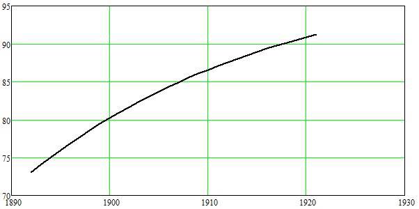 Если предположить, темпы ликвидации неграмотности для периода 1905-1913 (то есть для новобранцев 1884-1892 годов рождения) сохранились неизменными и дальше, то рост грамотности среди призывников выглядел бы следующим образом (по оси абцис отложены годы рождения новобранцев):
