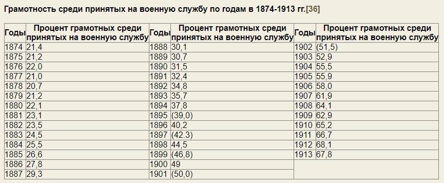 Автор: falesИзвестная таблица из БСЭ, показывающая как уменьшалась неграмотность среди новобранцев