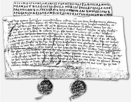 А что о другой грамотѣ, о которои Новъгородъ говорить, за Олексѣевои владыцнею пецатью и за посадницею Васильевой Федоровица и тысяцького Богъдана Обакуновица, а та грамота Ивану и его другамъ выдати; или не изанаидуть, не поминати ни въ вѣкы той грамотѣ опасной, а по томъ заморьскымъ нѣмѣцькымъ купьцамъ и на сомъ поморьи ничто не на-