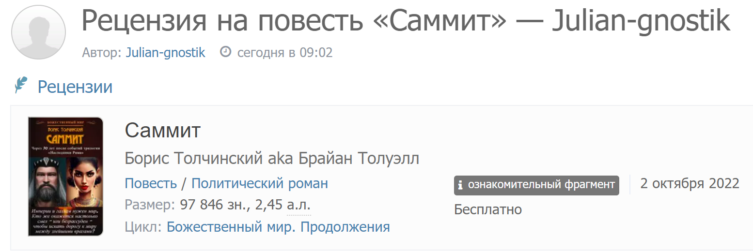 Автор: Борис Толчинский aka Брайан ТолуэллМногоуважаемый Julian-gnostik прочёл мой "Саммит" и написал прекрасную рецензию в свойственном ему духе.