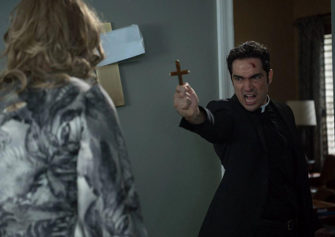 Крис устраивает встречу с тем самым сомневающимся священником – Дэмиеном Каррасом, который, не желая участвовать в духовных занятиях, соглашается хотя бы поговорить с девочкой. Он спрашивает у Риган девичью фамилию своей матери, Риган в ответ плюется зеленой жижей и говорит на перевернутом английским. Каррас мотает головой, чистит себя и говорит Крис, что ее дочка просто ненормальная и тут полезней будет фронтальная лоботомия, а не экзорцизм. Но мама, раскаявшись, сознается, что ее дочурка кокнула мистера Бёрка, а еще показывает надпись появившуюся в виде шрамов на животе у девочки – «хелп ми!»