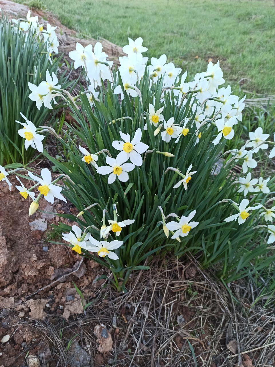 А весна красивая, с цветами - на фото дикие нарциссы, а еще есть маргаритки и немного ромашек. По выходным на всю улицу пахнет шашлыками: приезжают отдыхать дачники-"воскресники". Как перед ними не помяукать жалобно, не рассказать про голодную судьбу, не выклянчить кусочек мяса? А еще начали слетаться бабушки, которые всю зиму нянчили по городам внуков, а тут вспомнили, что пора грядки копать. А бабушки всегда угостят чем-то повкуснее, чем скучный сухой корм!