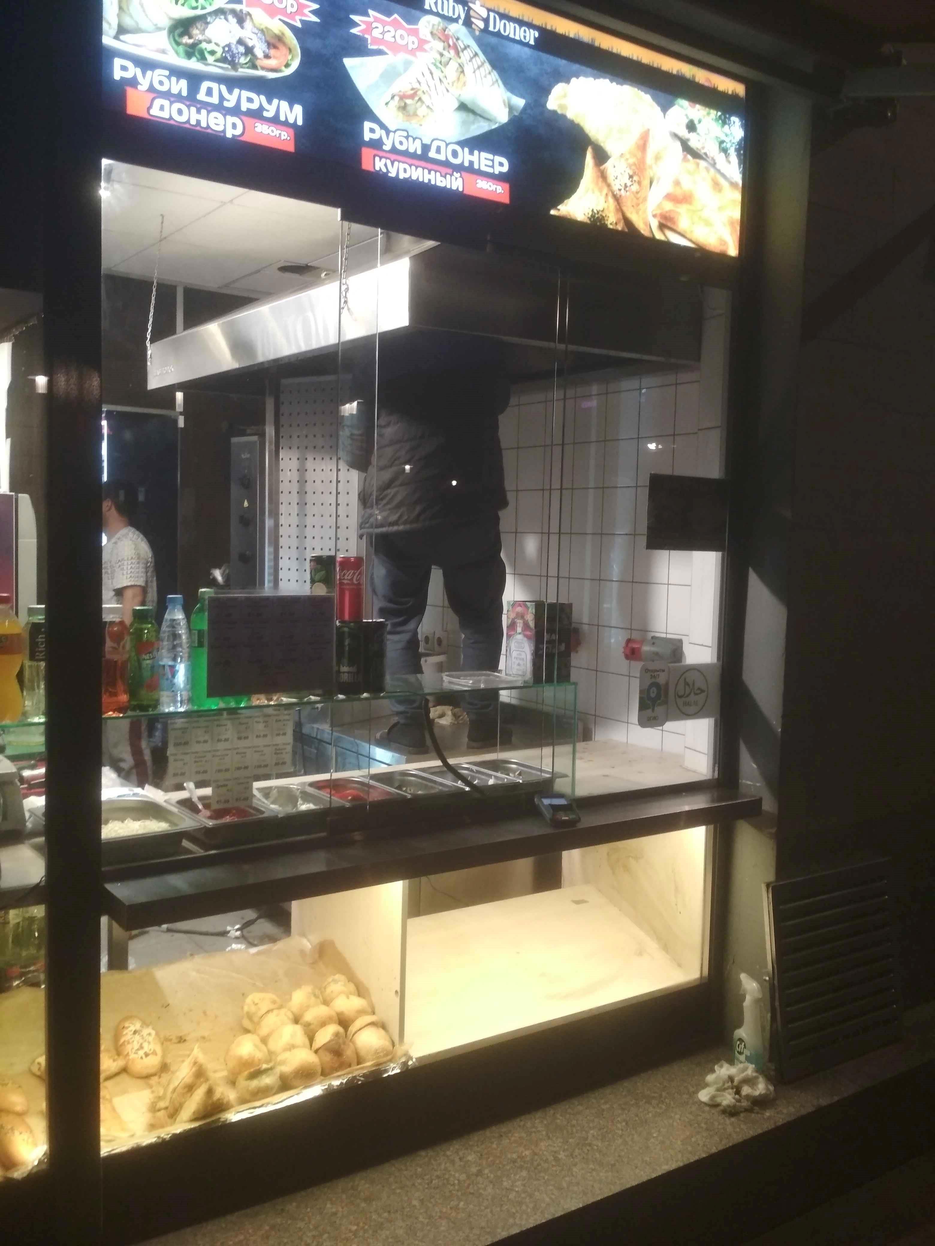 Ну, собственно всё на фото. Стоит он при этом в шлепках ровно там, где днём готовит шаурму, в шлепках, в 10 см от мяса. Москва, 50 метров от метро Смоленская, примерно 300 от Арбата.