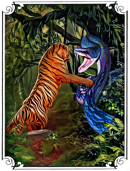 Дракон долгое время наблюдал, скрывшись в зарослях, за любовной игрой Змеи и Тигра. Тигр то прижимал Змею к земле и яростно рычал, то змея обвивала тело тигра смертоносными кольцами и сжимала в объятиях. Затем очень быстро они снова менялись местами. Иногда они наносили друг другу страшные раны, но не замечали этих ранений в пылу страстей. Ни один из них не хотел уступать, и поочередно одерживал верх. Обозленный тигр проглотил змею целиком.