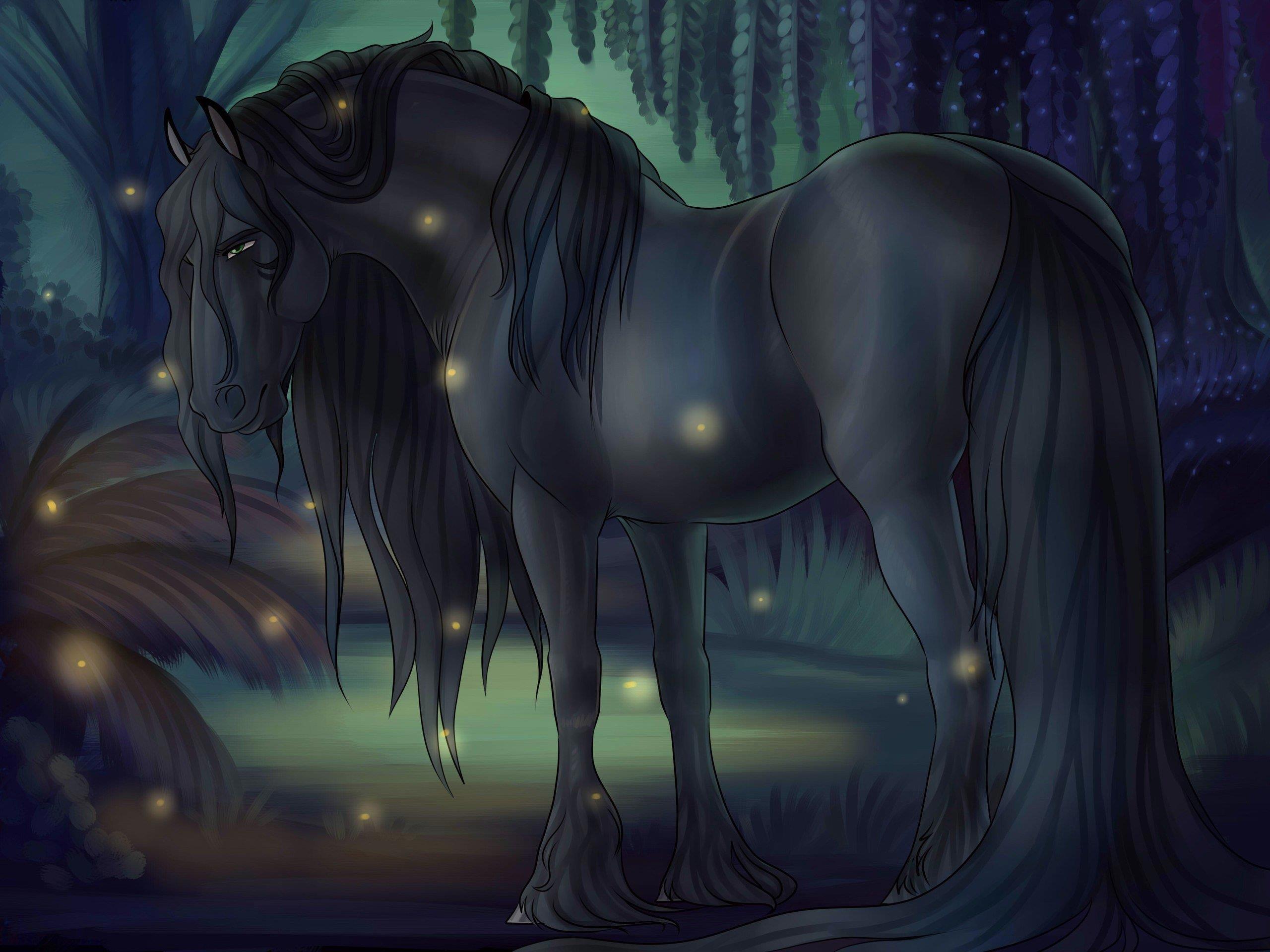 Дирк шутливо настаивал на своём. Белла отнекивалась и продолжала болтать о достопримечательностях Шотландии. Вдруг они замерли, увидев бесшумно вышедшего из леса на поляну вороного жеребца. Конь был красив, как мечта: чёрная как смоль, лоснящаяся шкура, тонкие точёные ноги, длинный хвост, маленькие уши. Своей грациозностью и изящно изогнутой шеей он напомнил Дирку арабских жеребцов. Грива и хвост коня казались влажными, как будто он не успел обсохнуть после купания. Парочка переглянулась, и Дирк прикрыл глаза, пряча возбуждение и предвкушение. Не зря они так долго торчали на берегу и тянули время.