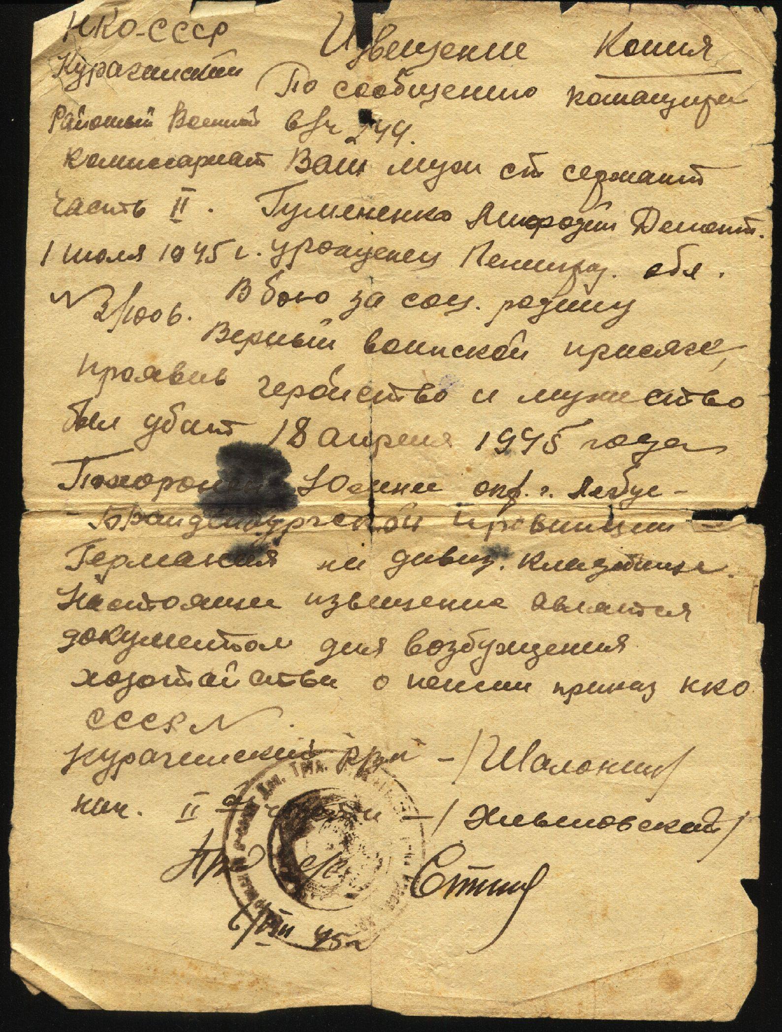 Мой дед, Мефодий Дементьевич Гуминенко, погиб 18 апреля 1945 года, под Берлином. Он был зенитчиком.