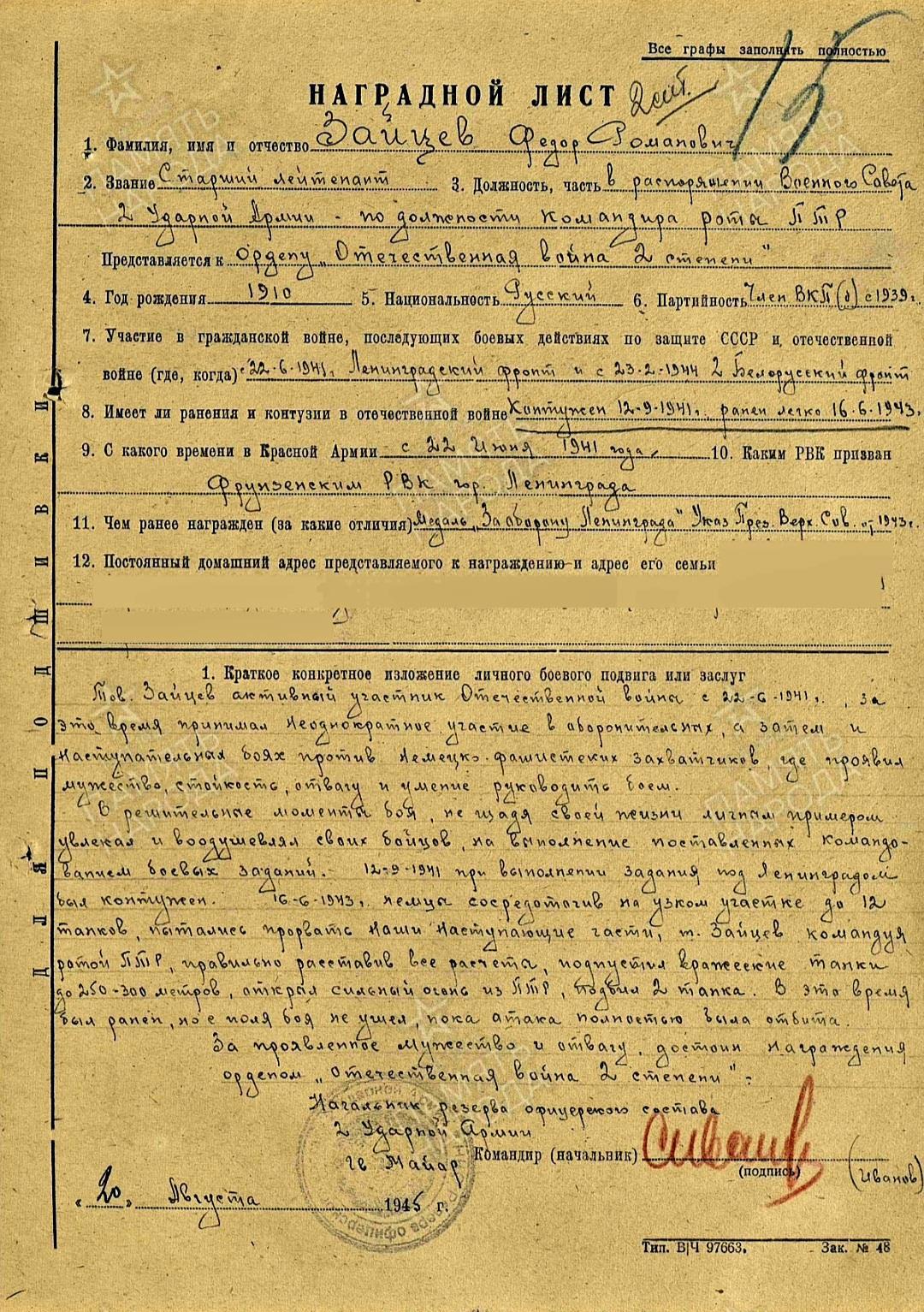 Мой дедушка Федя - прошёл всю войну и умер от ран в 1961 г. К сожалению, его я знала только по рассказам бабушки и мамы. Весельчак, балогур, добрейшей души человек...таким он остался в их памяти. Дедушка ушёл на войну рядовым, дошёл до Берлина и вернулся в звании капитана. Был награждён: Орденом "Великой Отечественной Войны", орденом "Славы", медалью "За отвагу", медалью за "Взятие Берлина".